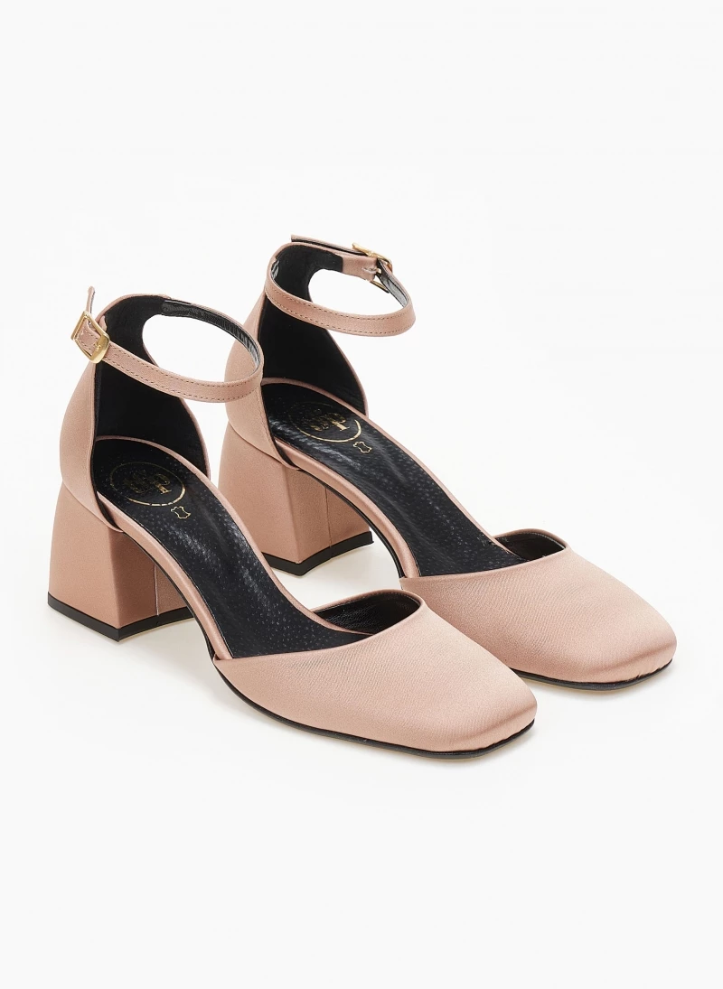 Γόβες tfp σε καρέ γραμμή με χαμηλό τακούνι. Έχουν ανοιχτά πλαϊνά. Κλειστή φτέρνα. Δένουν με μπαρέτα στο ύψος του αστραγάλου. Δερμάτινος πάτος. Ελληνικής κατασκευής.