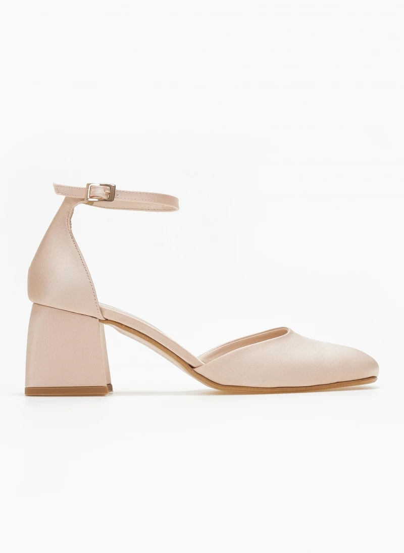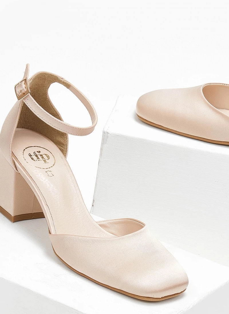 Γόβες tfp σε καρέ γραμμή με χαμηλό τακούνι. Έχουν ανοιχτά πλαϊνά. Κλειστή φτέρνα. Δένουν με μπαρέτα στο ύψος του αστραγάλου. Δερμάτινος πάτος. Ελληνικής κατασκευής.