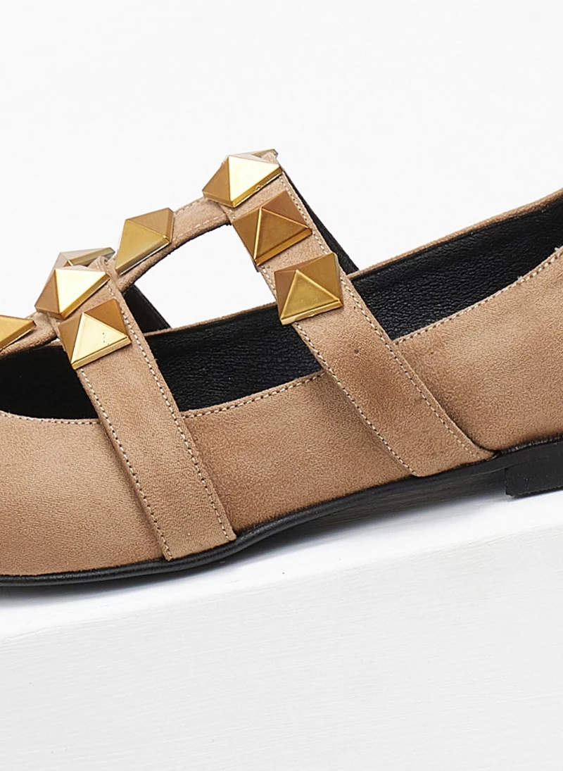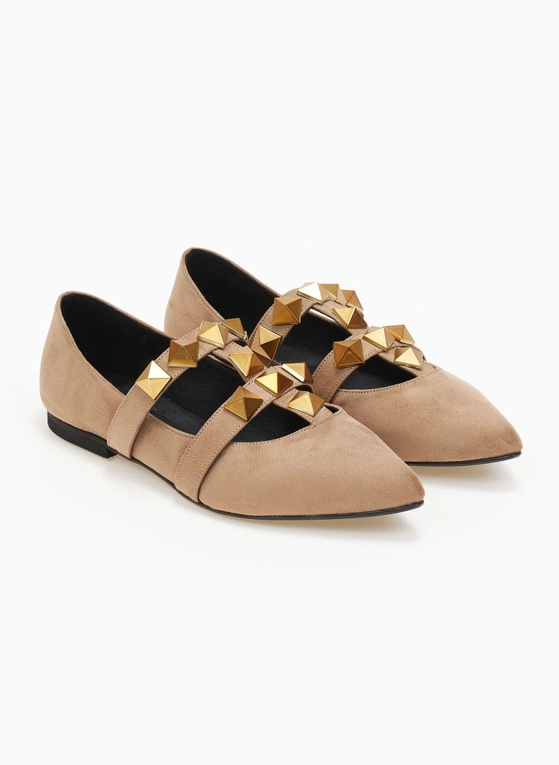 Mules μυτερά suede estil. Έχουν σχέδιο με μεταλλικά τρουκς στο επάνω μέρος. Δερμάτινος πάτος. Ελληνικής κατασκευής.