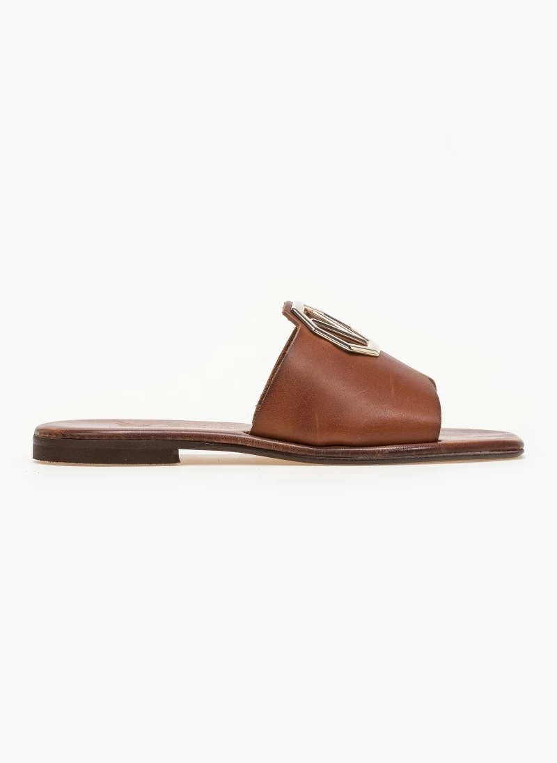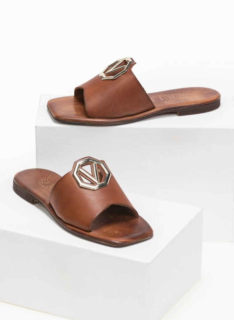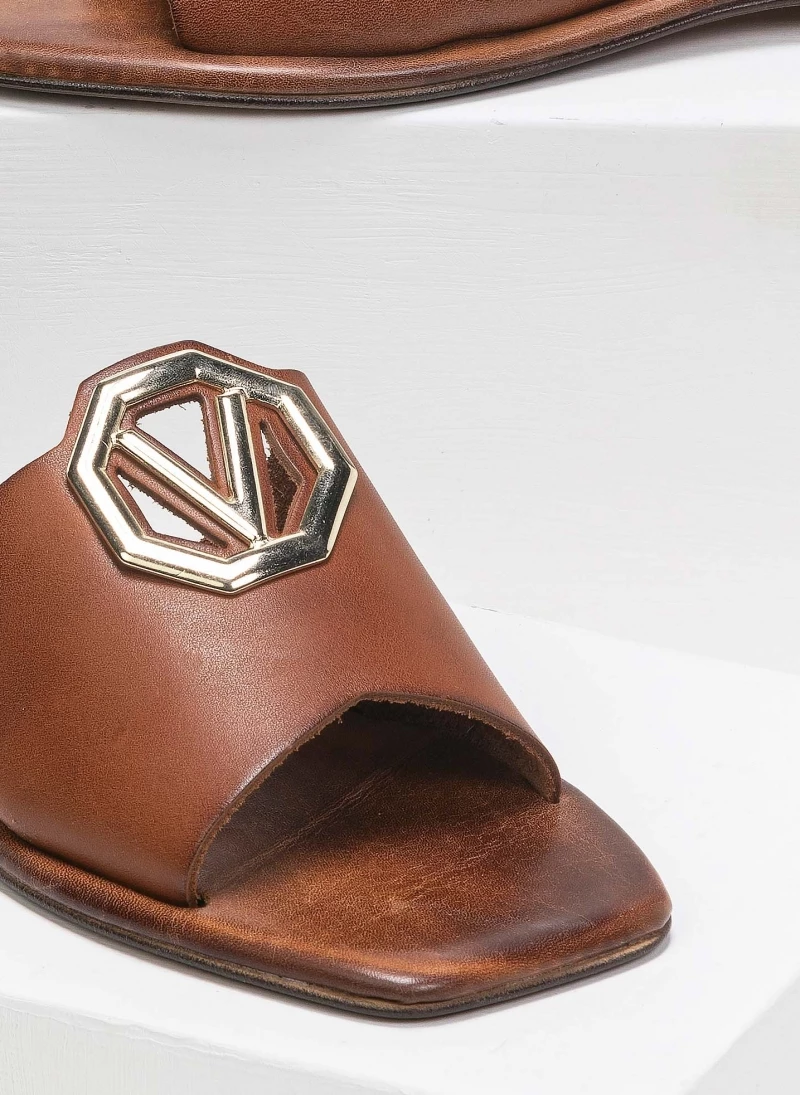 Καρέ δερμάτινα σανδάλια με φαρδιά φάσα και μεταλλικό διακοσμητικό με V σχέδιο. Ο πάτος είναι δερμάτινος με ενίσχυση. Ελληνικής κατασκευής, χειροποίητα.
