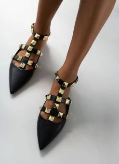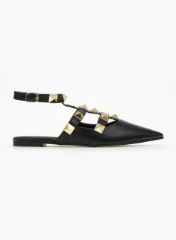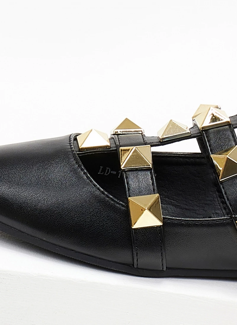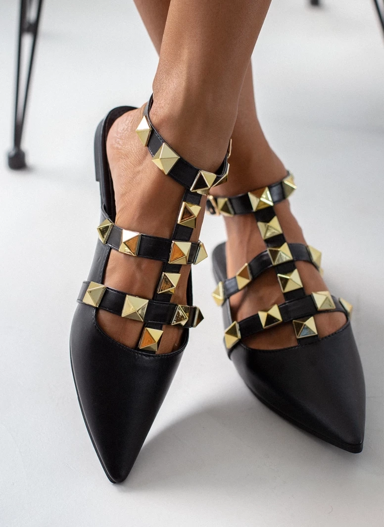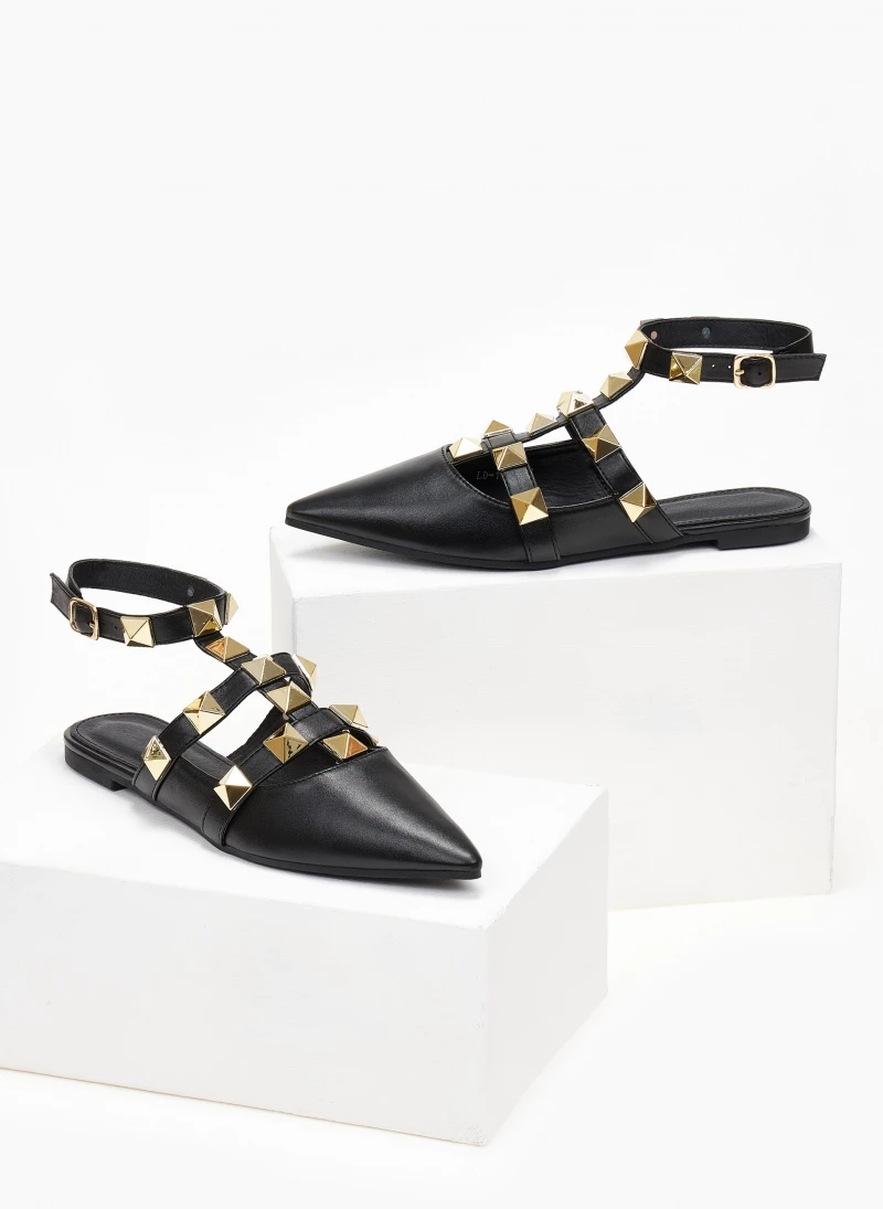 Μυτερές ανοιχτές μπαλαρίνες με μεταλλικά τρουκς. Δένουν με μπαρέτα στο ύψος του αστραγάλου.