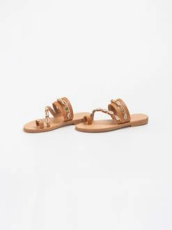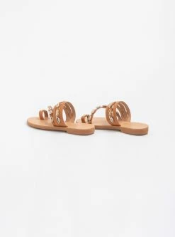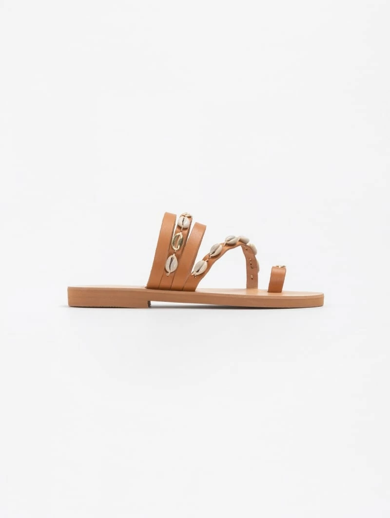 Δερμάτινα flat πέδιλα με διακοσμητικά κοχύλια σε φυσικό και χρυσό χρώμα. Χειροποίητα,ελληνικής κατασκευής.