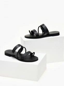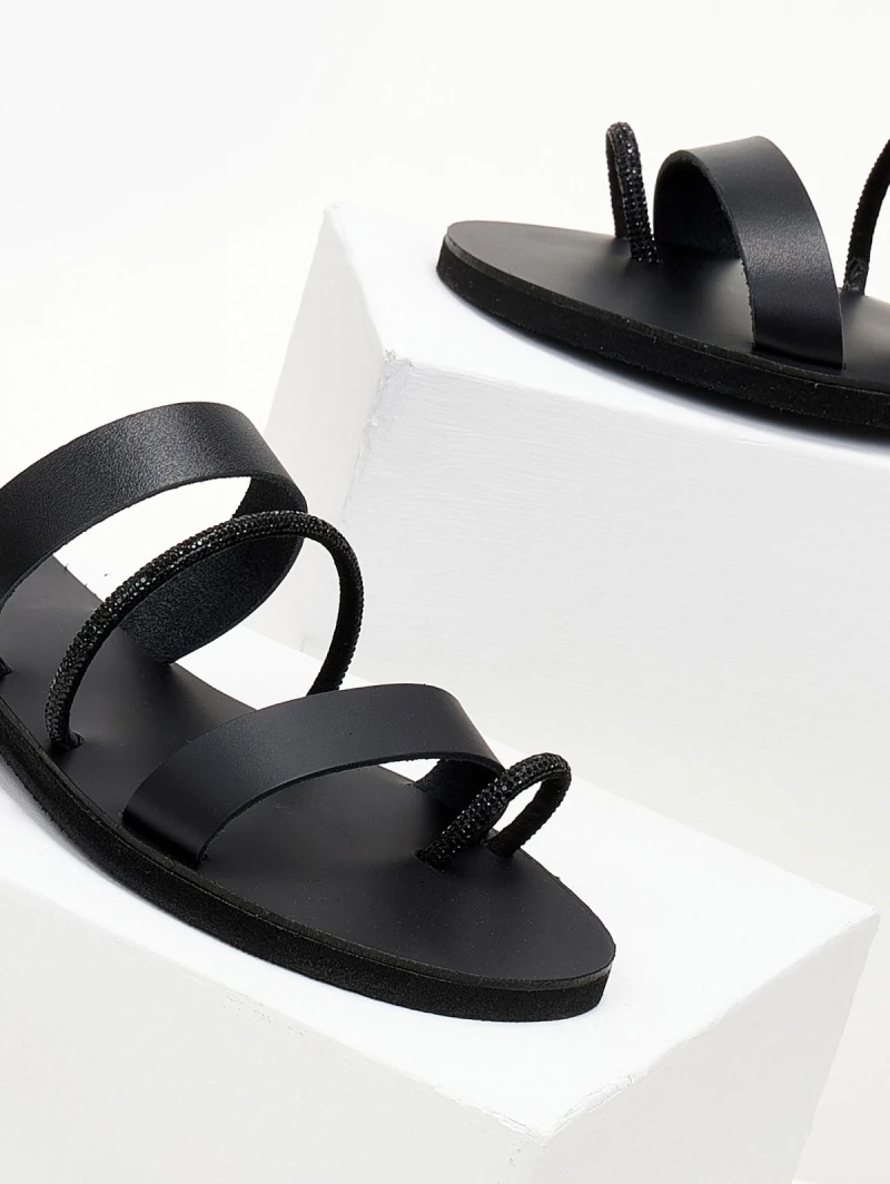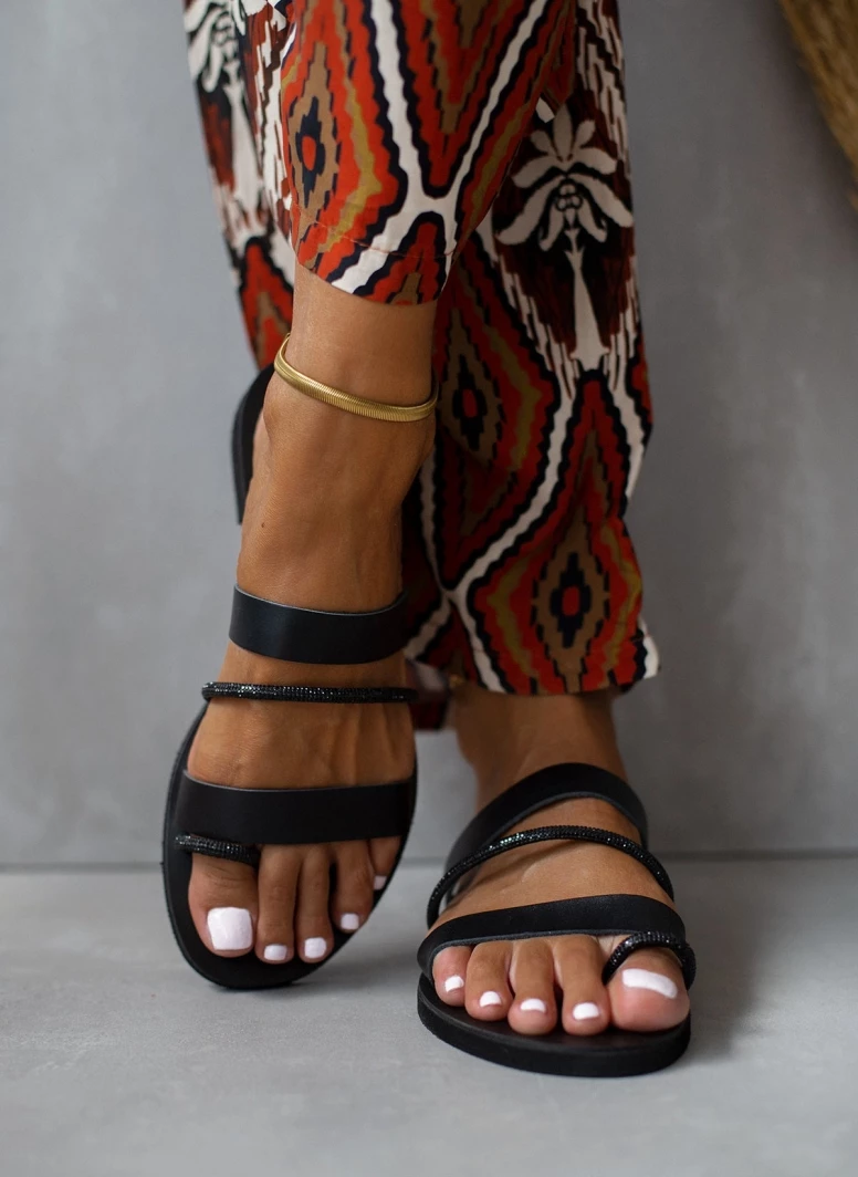 ESTIL δερμάτινα σανδάλια με τρείς φάσες. Έχουν λεπτή σειρά strass στή μεσαία φάσα και στο δάχτυλο. Γνήσιο δέρμα. ΄Ελληνικής κατασκευής.
