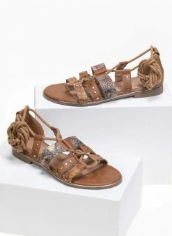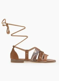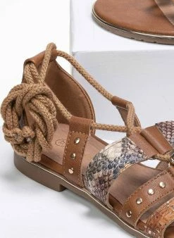 Ίσια σανδάλια με animal print λουράκια. Έχουν μεταλλική λεπτομέρεια περιμετρικά της σόλας. Η φτέρνα είναι κλειστή και δένουν με κορδόνια. Η σόλα είναι από λάστιχο.