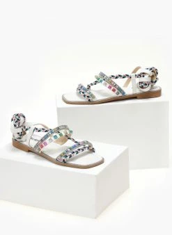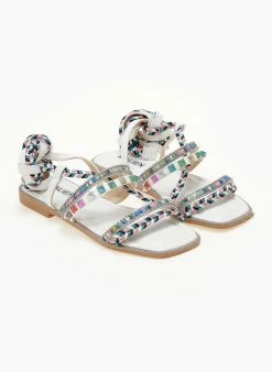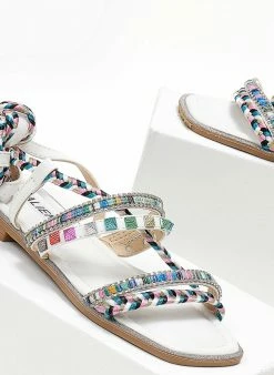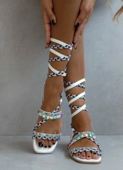 Σανδάλια suede σε συνδυασμούς χρωμάτων. Έχουν χρωματιστά τρουκς και διακριτικά strass. Δένουν με κορδόνια στο ύψος της γάμπας. Καρέ γραμμή.