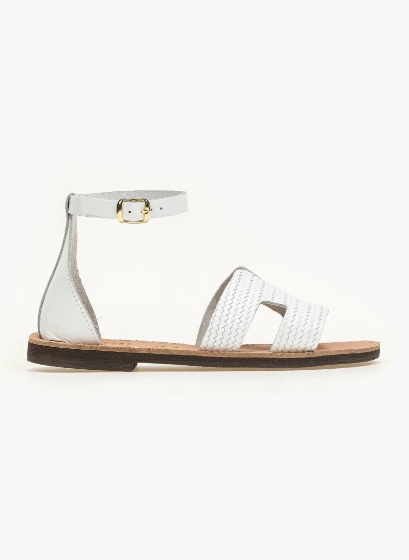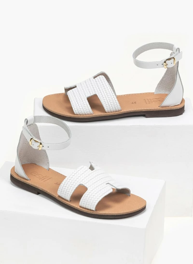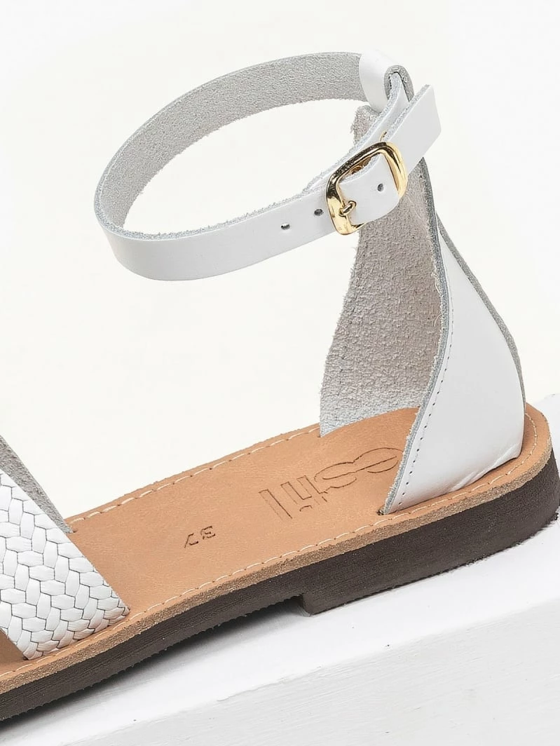 Estil ίσια πέδιλα με ανοίγματα στη φάσα. Έχουν pattern ψάθα. Η φτέρνα είναι κλειστή και δένουν με μπαρέτα στο ύψος του αστραγάλου. Ελληνικής κατασκευής,χειροποίητα.