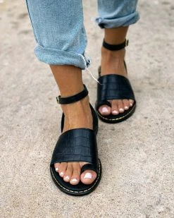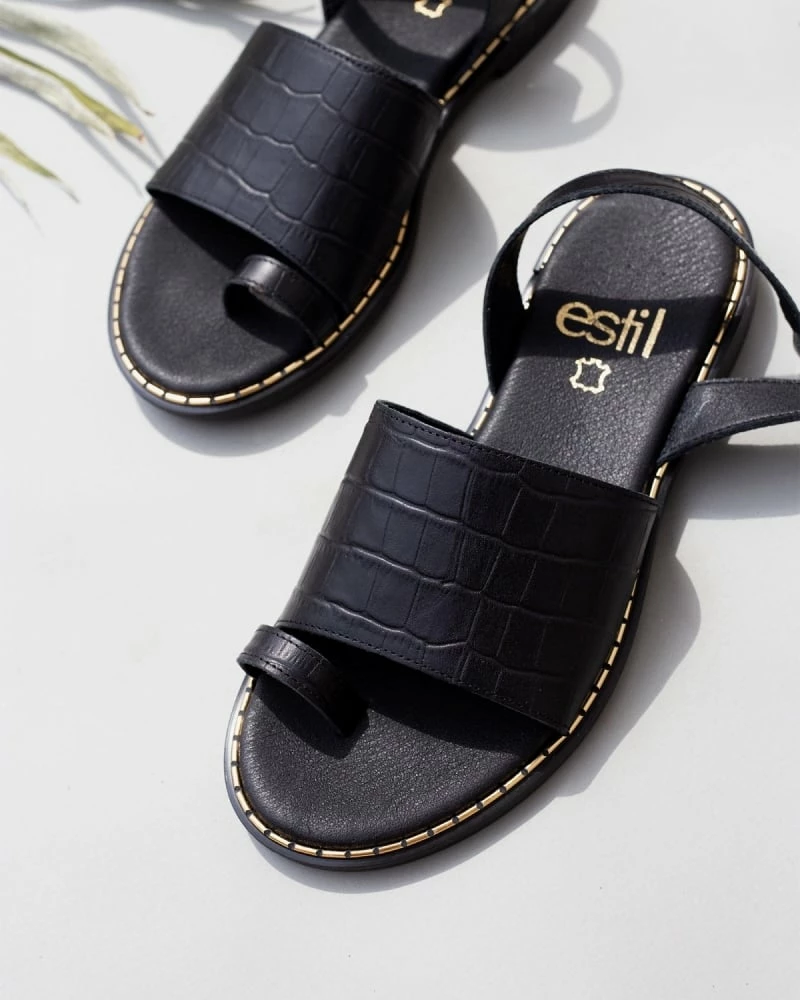 Estil δερμάτινα ίσια πέδιλα. Έχουν φαρδιά φάσα με κροκό pattern. Ο πάτος είναι δερμάτινος με ενίσχυση. Δένουν με λουράκια στο ύψος του αστραγάλου. Ελληνικής κατασκευής.
