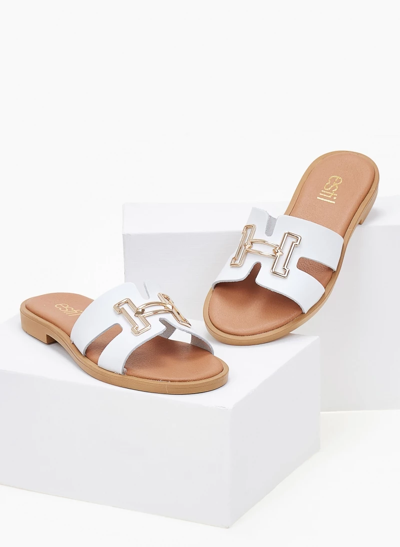 Δερμάτινα σανδάλια Estil με φαρδιά φάσα με ανοίγματα. Έχουν μεταλλικό διακοσμητικό. Ο πάτος είναι μαλακός με ενίσχυση. Ελληνικής κατασκευής.