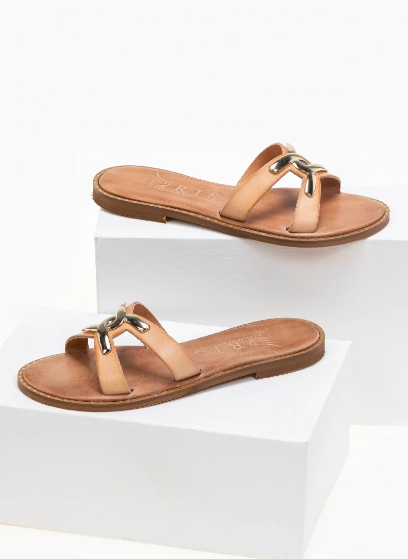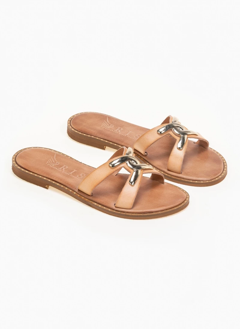 Δερμάτινα σανδάλια με χιαστί λουράκια και μεταλλική αγκράφα. Έχουν λεπτομέρεια σε μεταλλικό χρώμα περιμετρικά της σόλας. Ο πάτος είναι δερμάτινος. Ελληνικής κατασκευής, χειροποίητα.