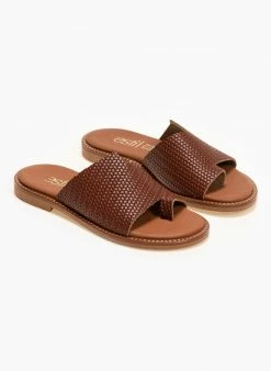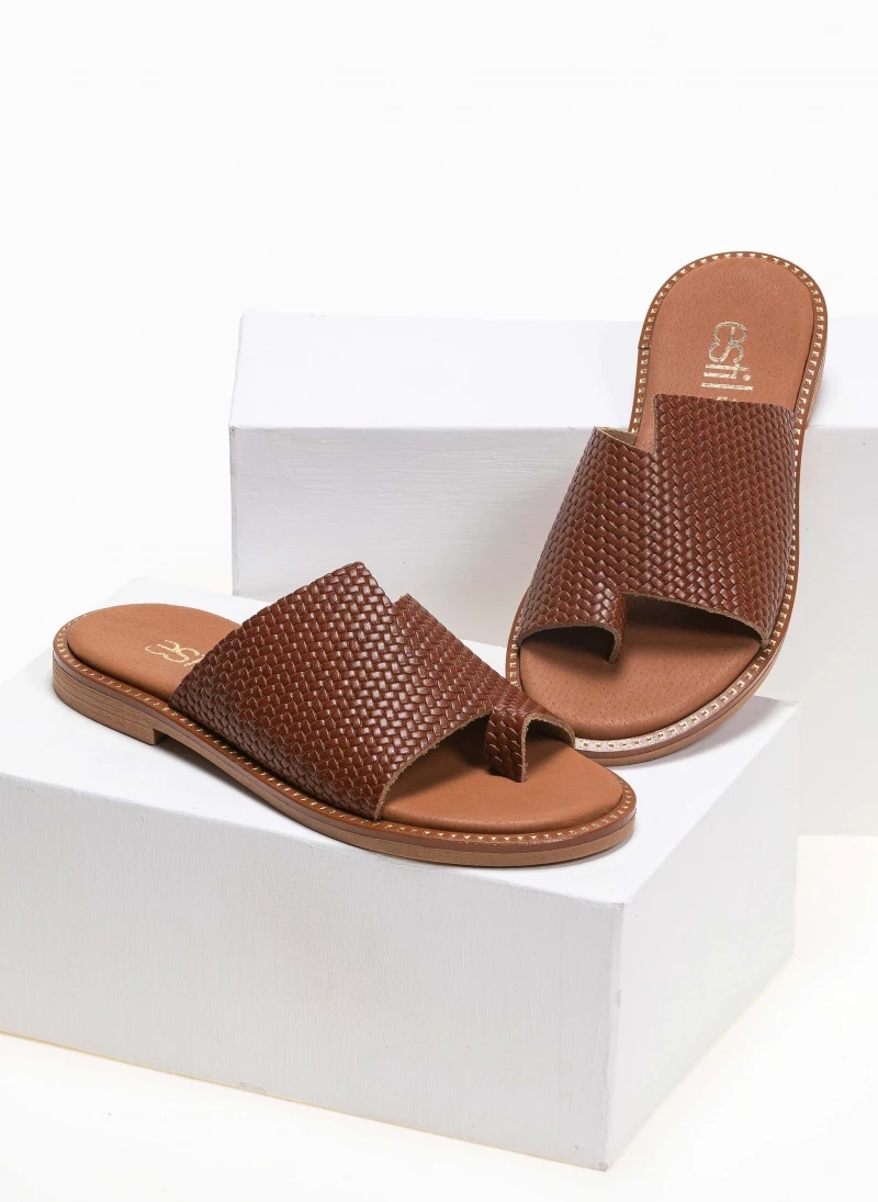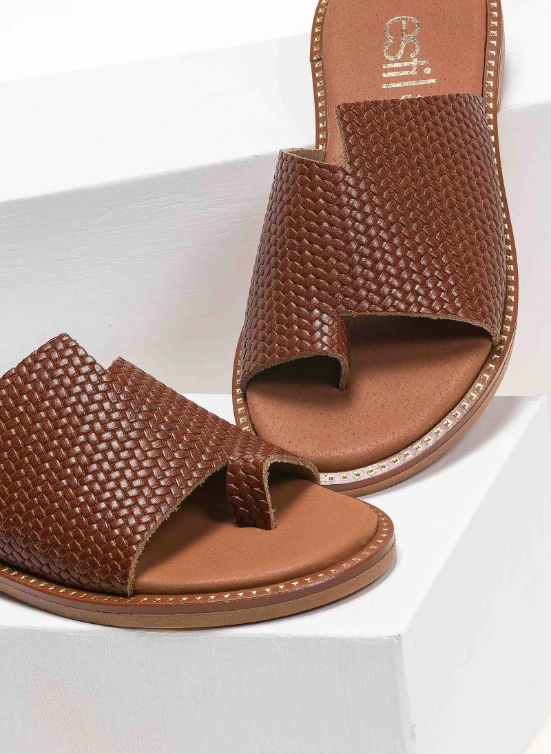 Estili δερμάτινα σανδάλια με άνισο τελείωμα. Έχουν ανάγλυφο pattern ψάθα. Ο πάτος είναι δερμάτινος με ενίσχυση. Ελληνικής κατασκευής, χειροποίητα.
