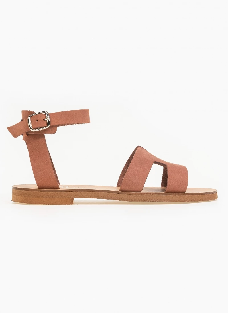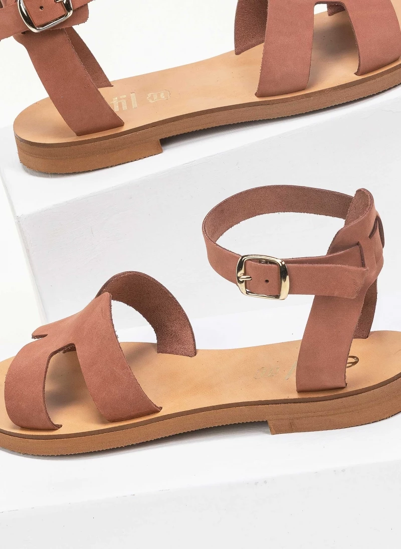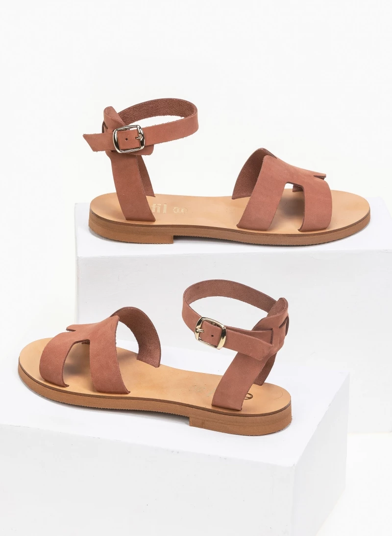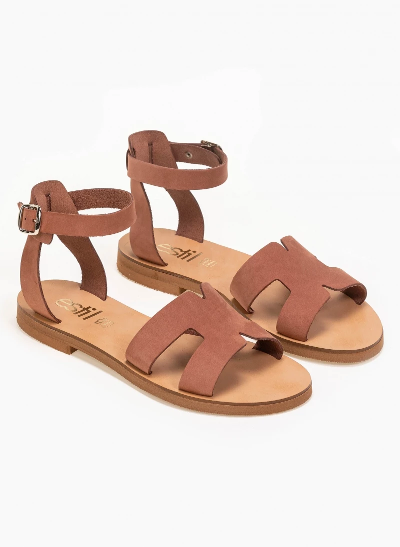 Estil φλατ δερμάτινα πέδιλα με ανοίγματα στη φάσα. Δένουν με μπαρέτα στο ύψος του αστραγάλου. Ελληνικής κατασκευής, χειροποίητα.