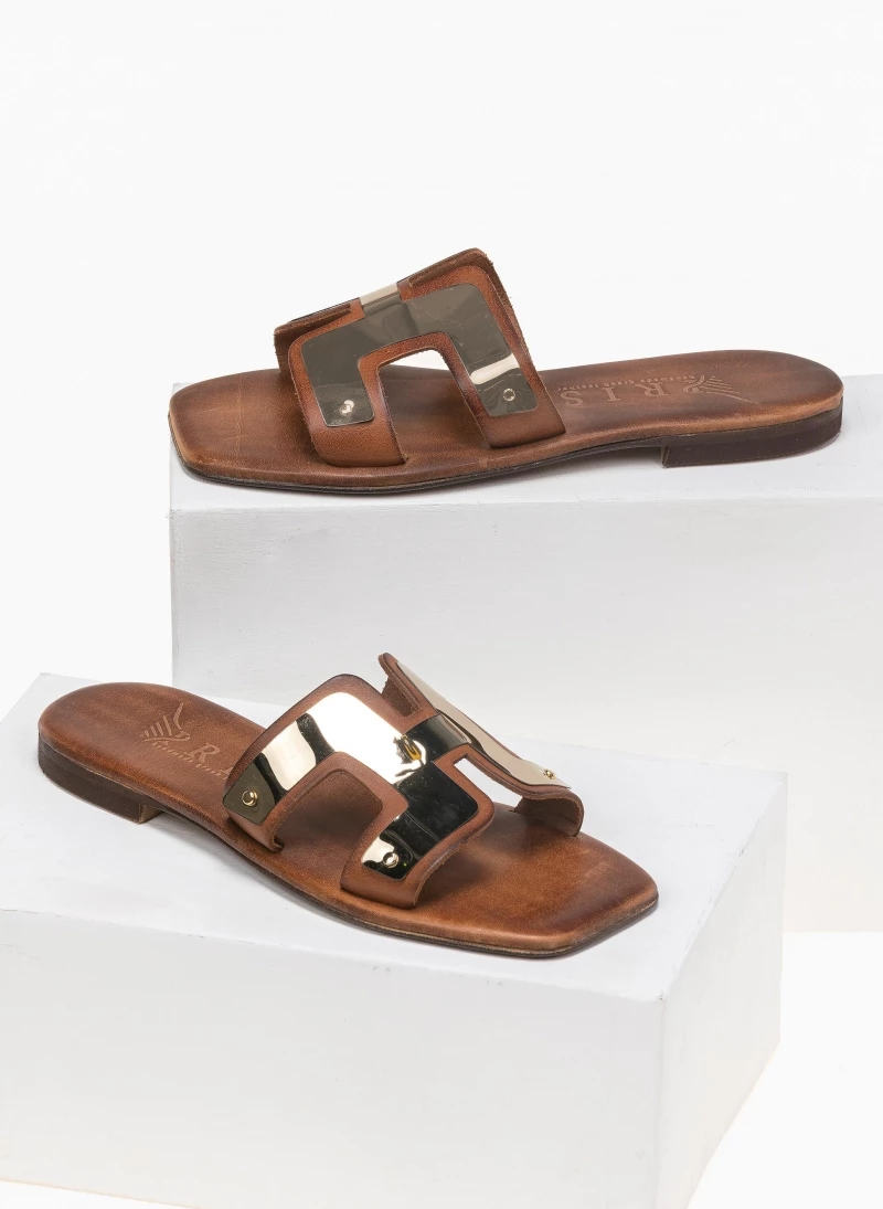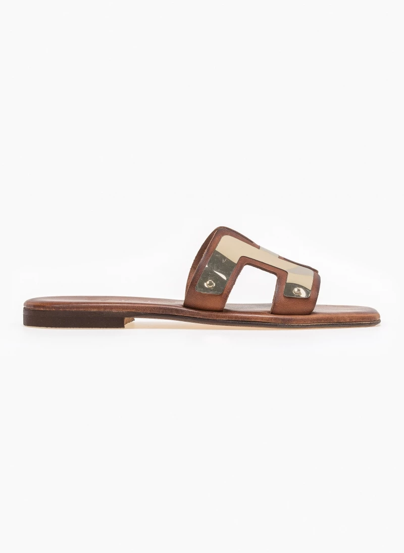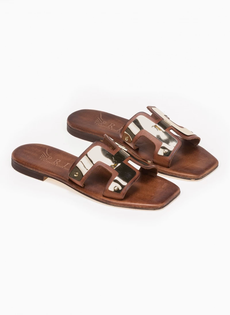 Καρλε δερμάτινα ίσια πέδιλα με μεταλλική λεπτομέρεια. Έχουν ανοίγματα στο πλάι. Δερμάτινος πάτος. Ελληνικής κατασκευής, χειροποίητα.