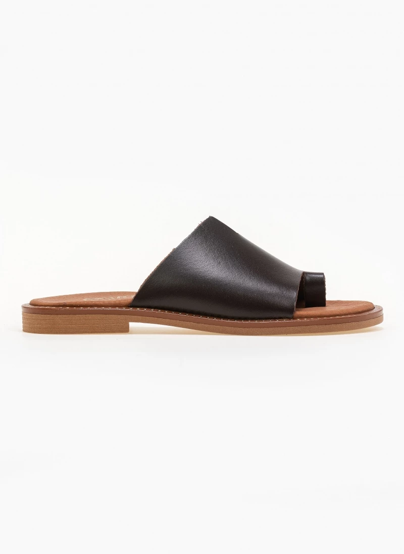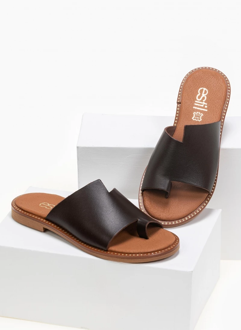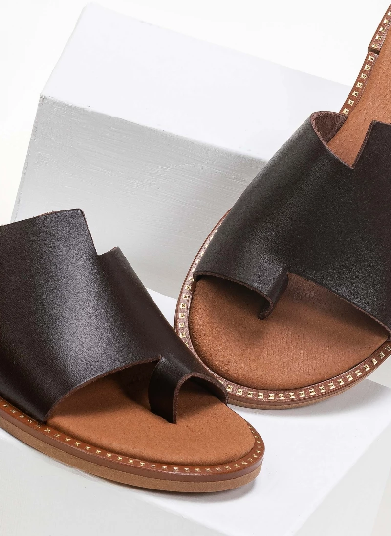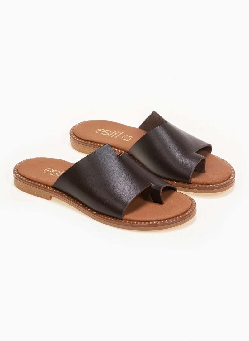 Estil δερμάτινα σανδάλια με φαρδιά φάσα και άνισο τελείωμα. Ο πάτος είναι δερμάτινος. Η σόλα είναι μαλακή. Ελληνικής κατασκευής.