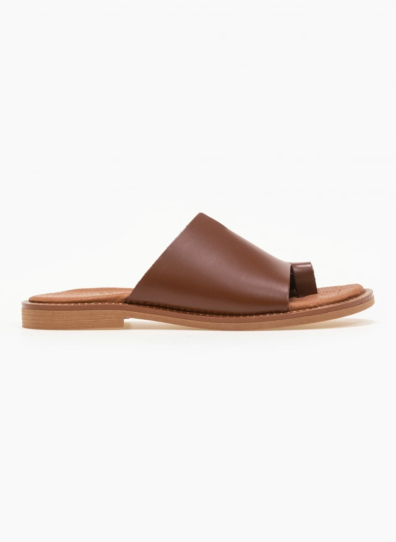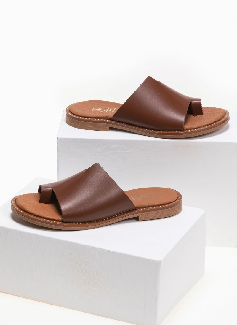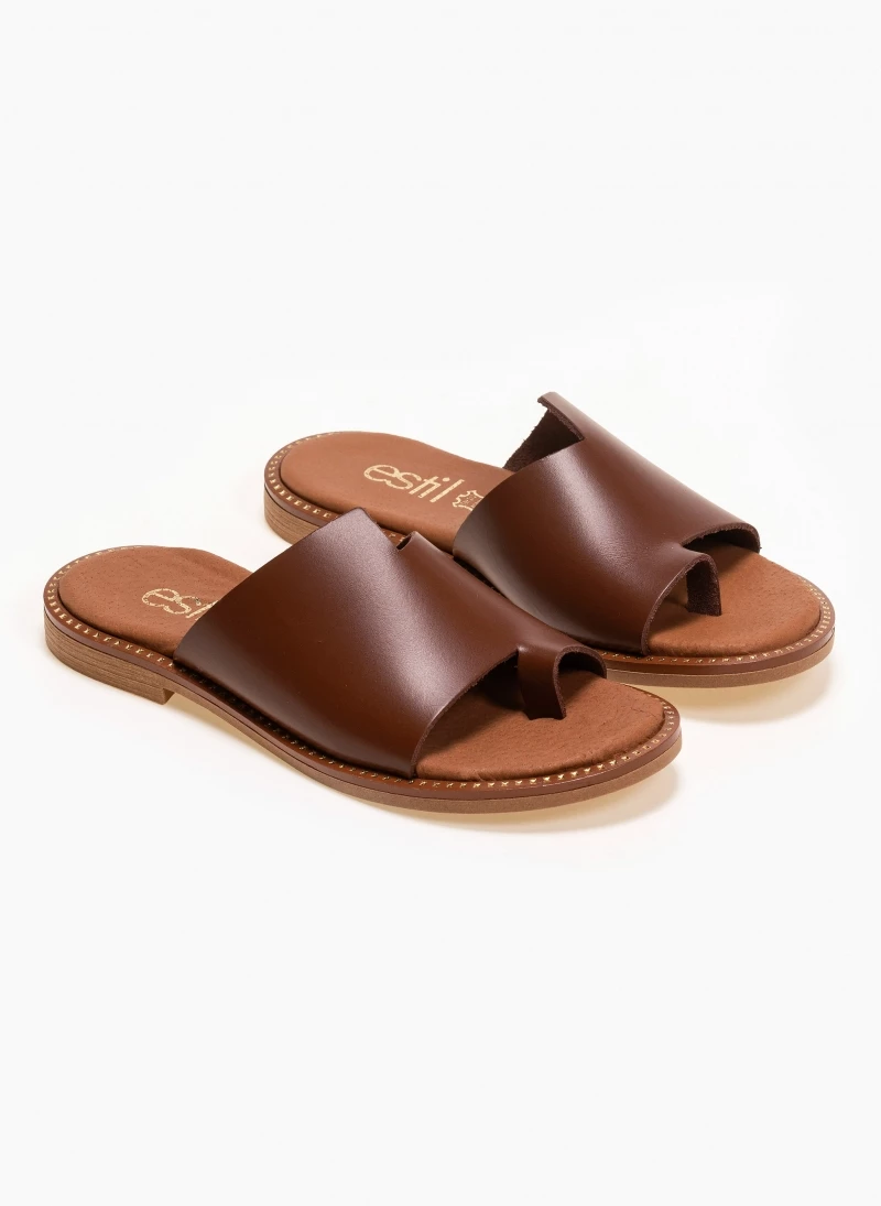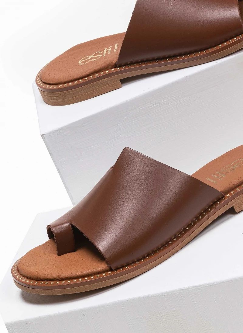 Estil δερμάτινα σανδάλια με φαρδιά φάσα και άνισο τελείωμα. Ο πάτος είναι δερμάτινος. Η σόλα είναι μαλακή. Ελληνικής κατασκευής.