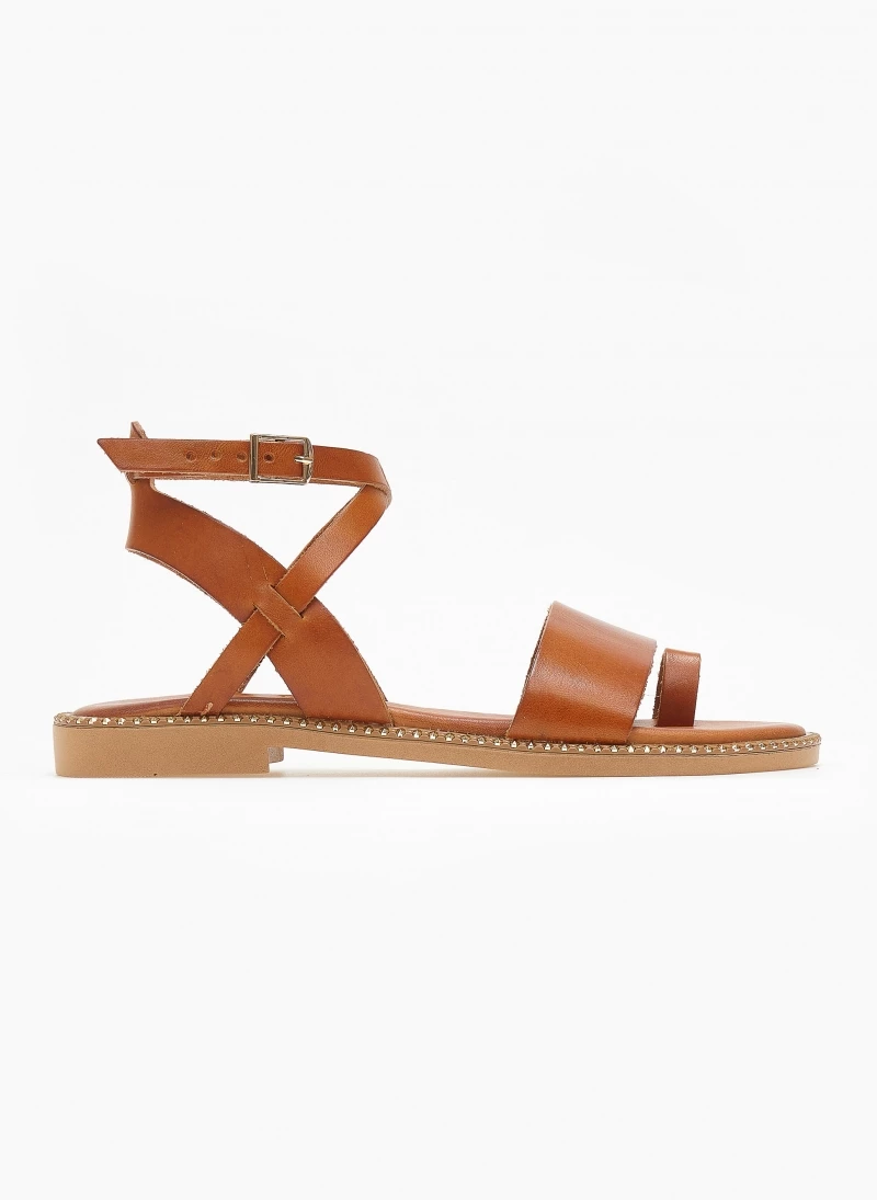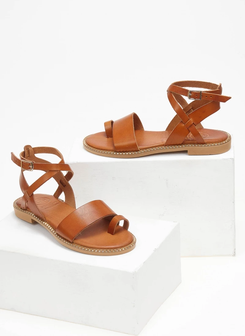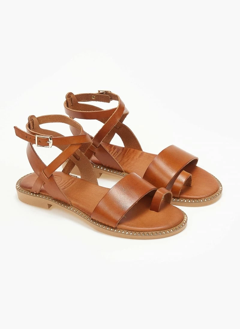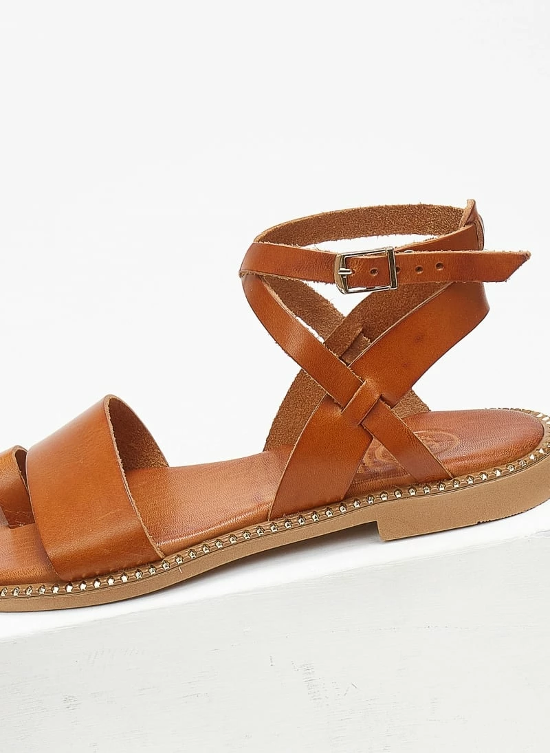 Tfp δερμάτινα σανδάλια με λεπτή φάσα. Έχουν μαλακό δερμάτινο πάτο με ενίσχυση. Κλείνουν με χιαστί λουράκι στο ύψος του αστραγάλου. Έχουν μεταλλικές λεπτομέρειες περιμετρικά της σόλας. Ελληνικής κατασκευής.