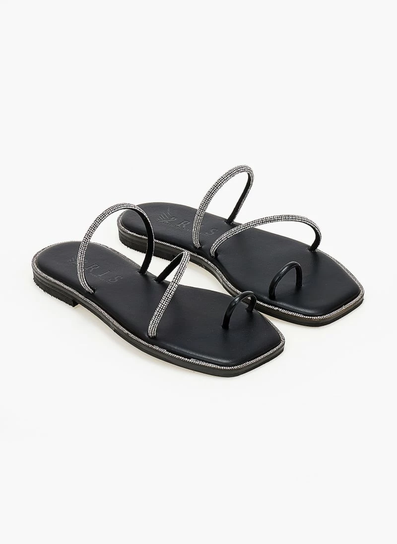 Σανδάλια δερμάτινα IRIS με διακριτικά strass λουράκια. Έχουν λεπτά strass περιμετρικά της σόλας. Καρέ γραμμή. Δερμάτινος πάτος με ενίσχυση. Ελληνικής κατασκευής,χειροποίητα.