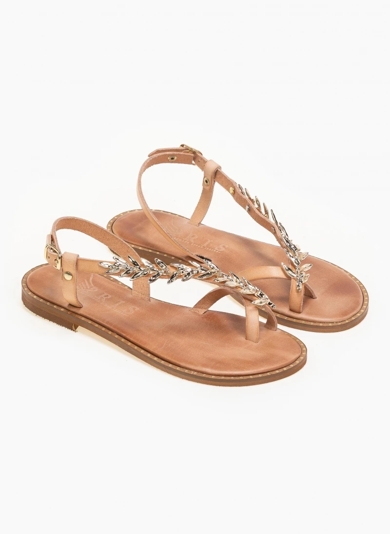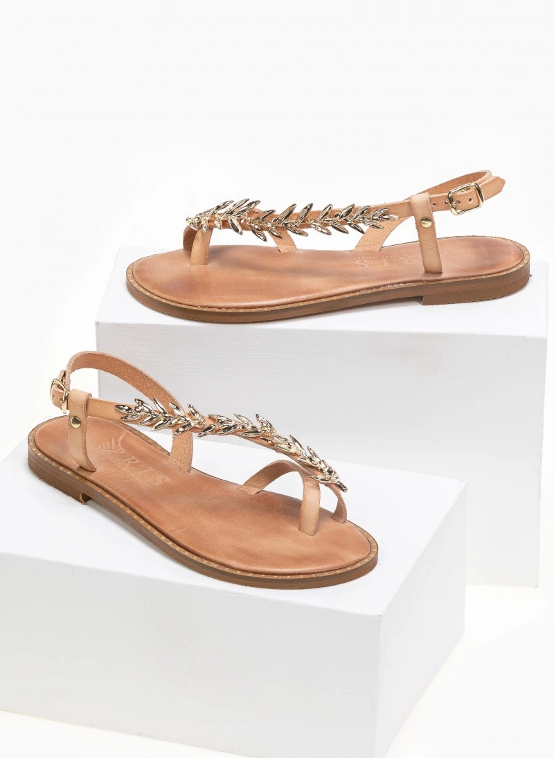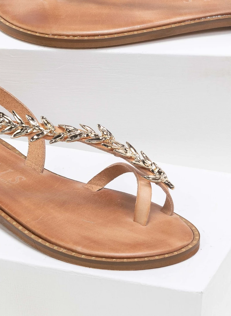 Δερμάτινα ίσια πέδιλα με λοξή φάσα. Έχουν μεταλλικό διακοσμητικό με σχέδιο φύλλα ελιάς. Ο πάτος είναι δερμάτινος με ενίσχυση και έχουν λεπτομέρεια σε μεταλλικό χρώμα περιμετρικά της σόλας. Ελληνικής κατασκευής, χειροποίητα.