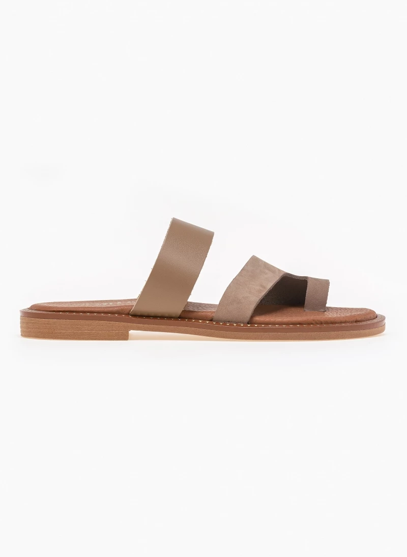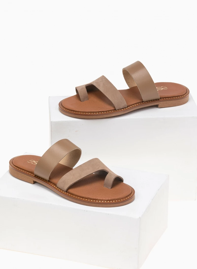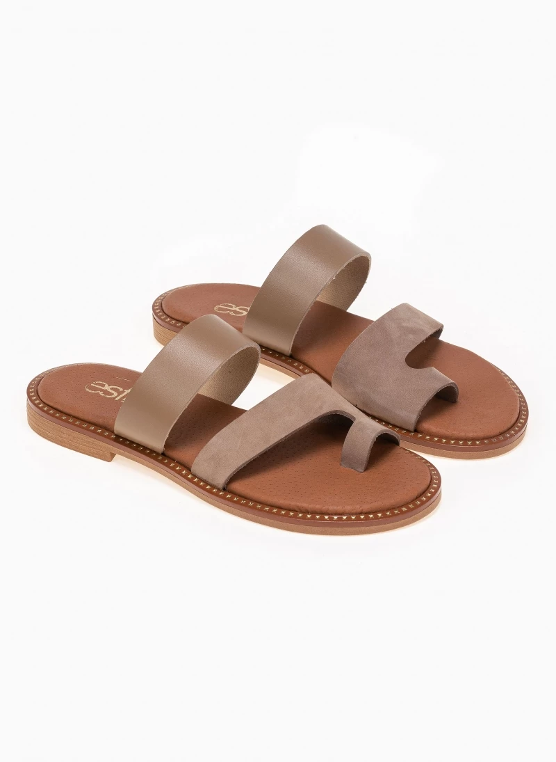 Estil δερμάτινα σανδάλια. Συνδυάζουν ματ και nubuck δέρμα. Ο πάτος είναι δερμάτινος με ενίσχυση. Έχουν λεπτομέρεια μεταλλικό χρώμα περιμετρικά της σόλας. Ελληνικής κατασκευής, χειροποίητα.