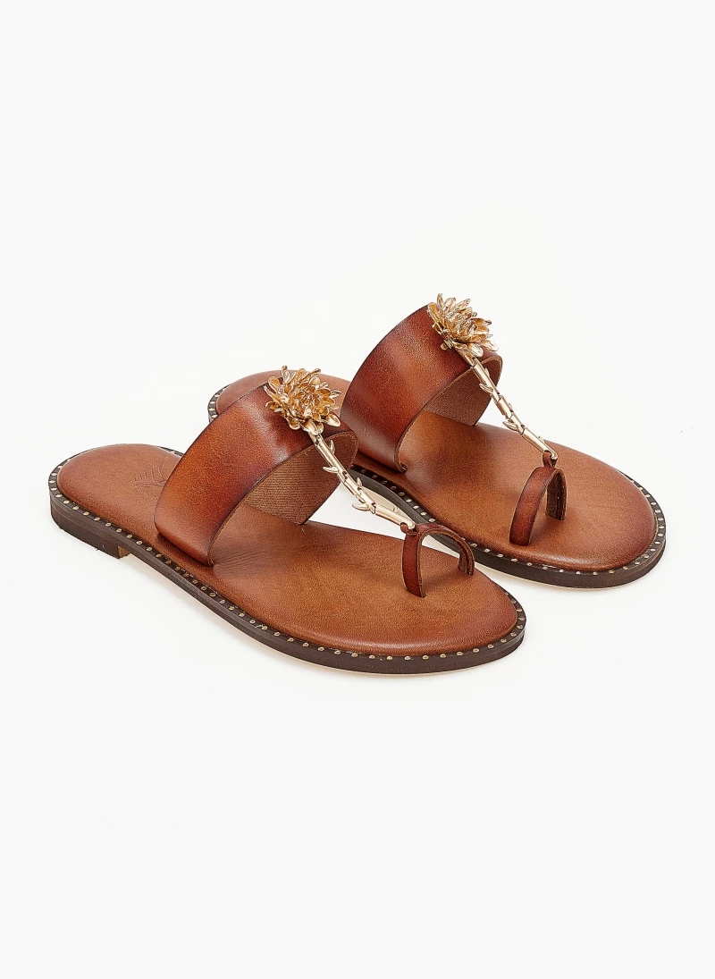 Σανδάλια δερμάτινα IRIS με μεταλλικό διακοσμητικό λουλούδι. Έχουν δερμάτινο πάτο με ενίσχυση. Λεπτομέρεια σε μεταλλικό χρώμα περιμετρικά της σόλας. Ελληνικής κατασκευής,χειροποίητα.
