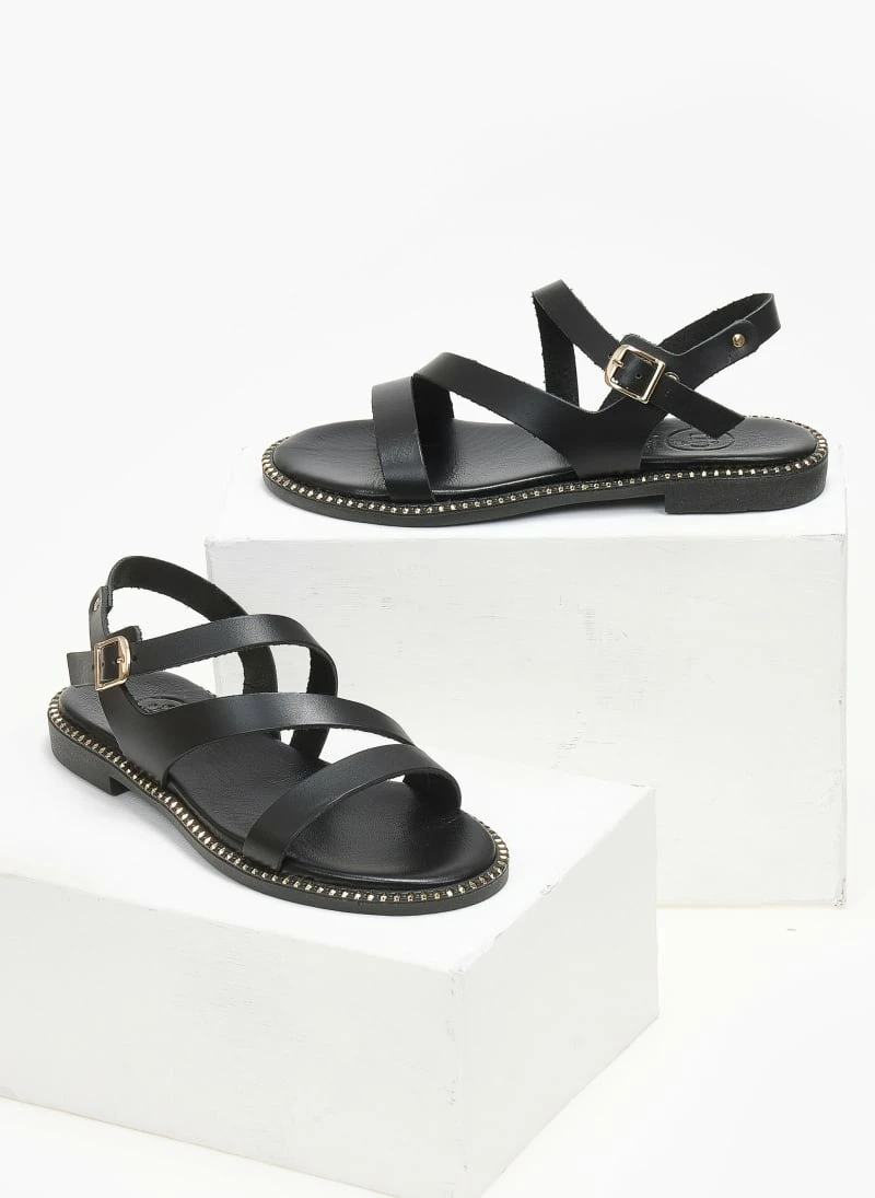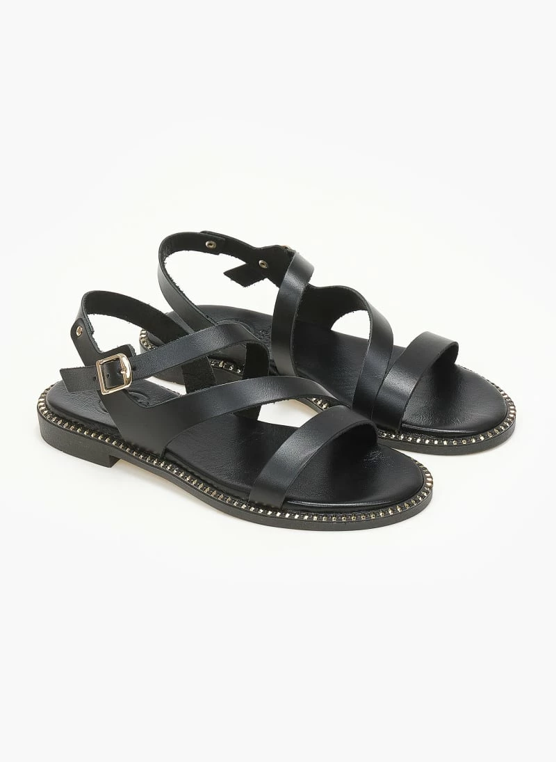 Σανδάλια δερμάτινα tfp με δέσιμο στο πλάι. Έχουν λοξό λουράκι στο κουτεπιέ. Δερμάτινος πάτος με ενίσχυση. Μεταλλικές λεπτομέρειες περιμετρικά της σόλας. Ελληνικής κατασκευής.