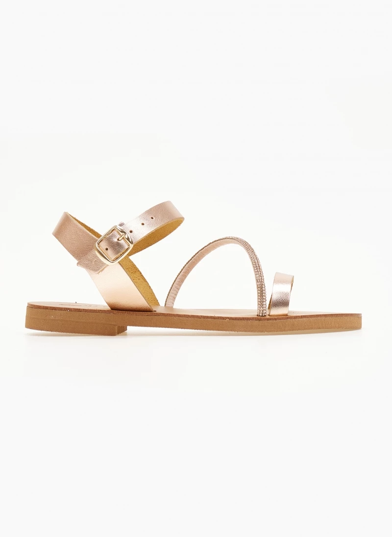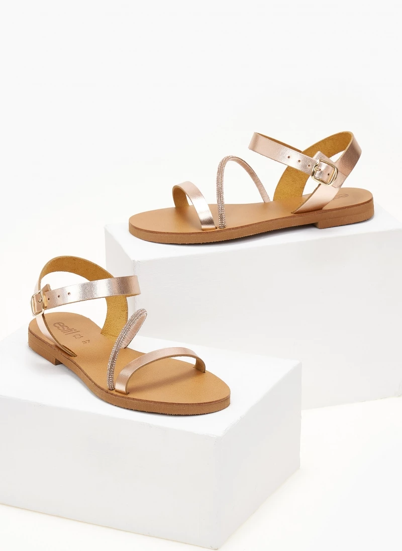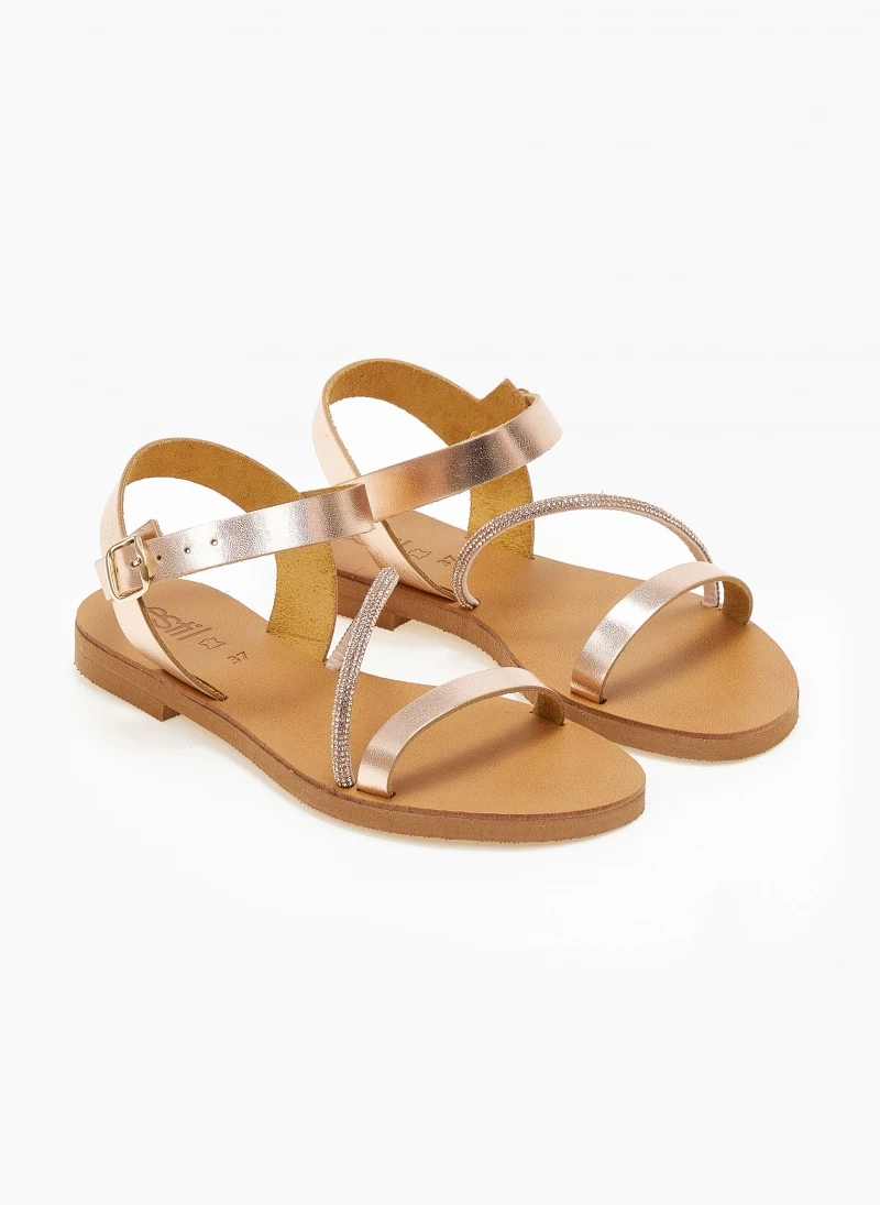 Σανδάλια δερμάτινα ESTIL. Έχουν λοξό strass λουράκι στο κουτεπιέ. Δένουν στο πλάι του αστράγαλου με κούμπωμα. Δερμάτινος πάτος. Ελληνικής κατασκευής.