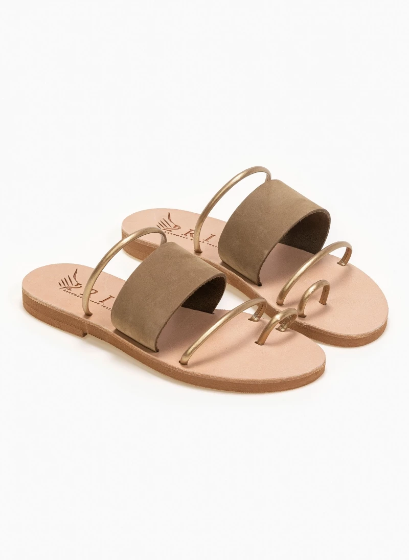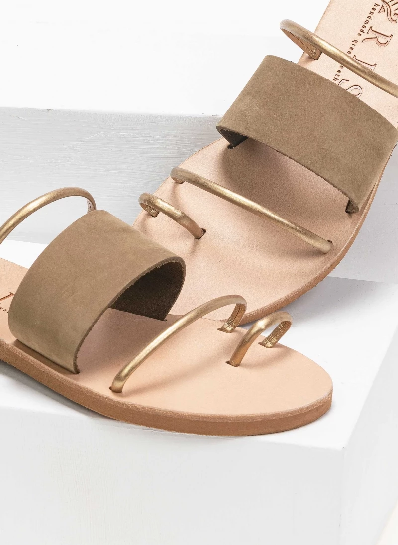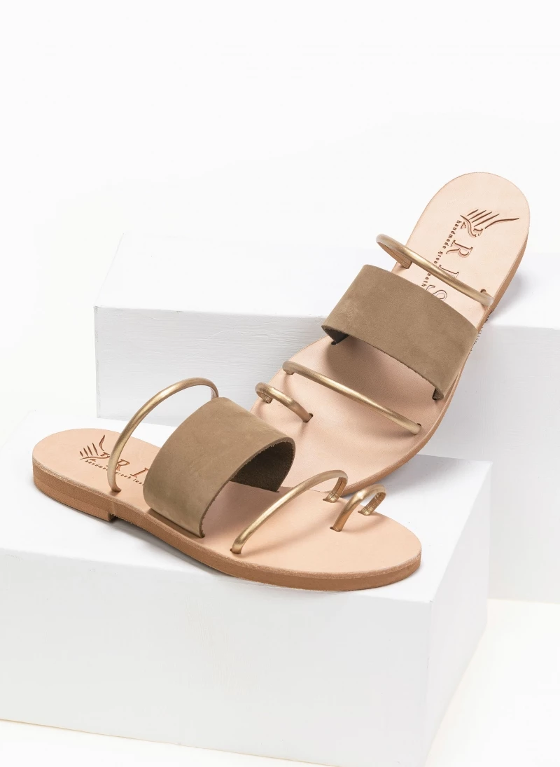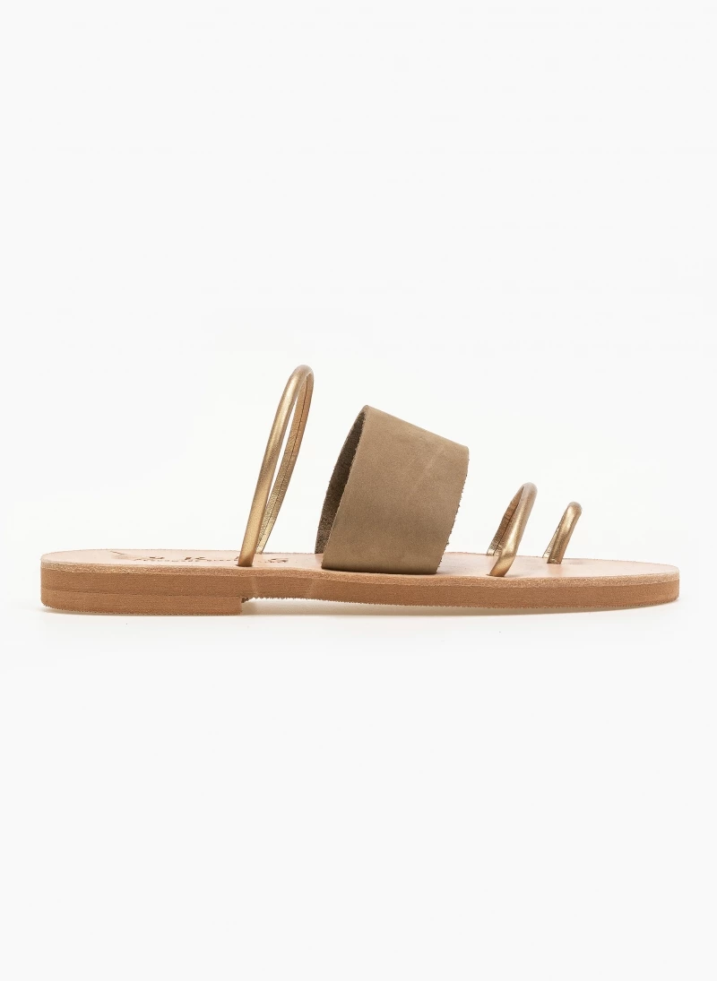 Δερμάτινα σανδάλια με φαρδιά φάσα και λεπτά λουράκια σε μεταλλικό χρώμα. Ελληνικής κατασκευής, χειροποίητα.