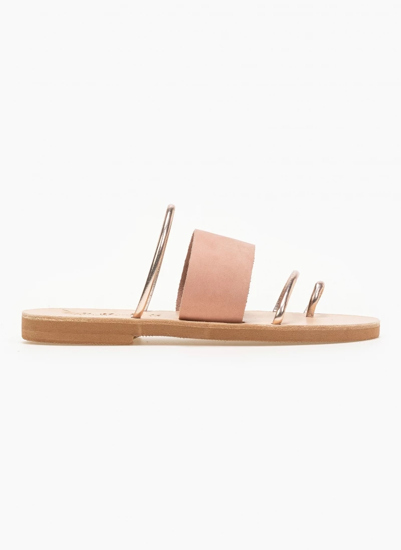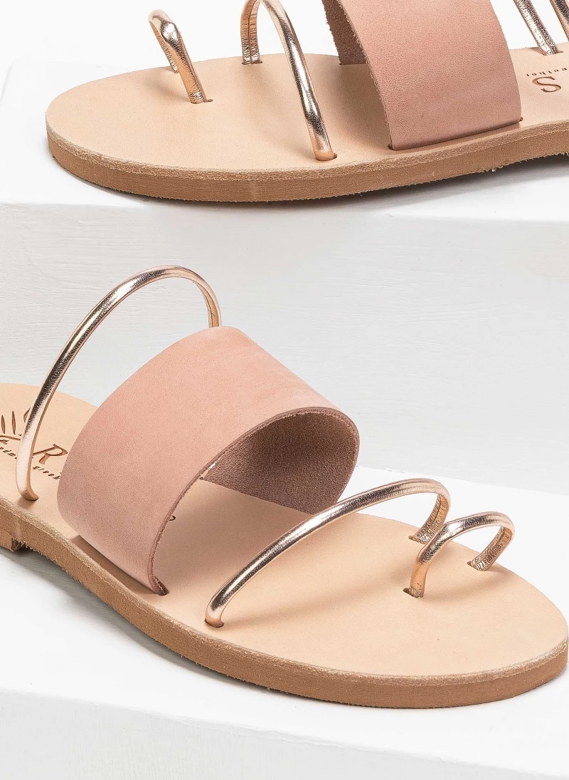 Δερμάτινα σανδάλια με φαρδιά φάσα και λεπτά λουράκια σε μεταλλικό χρώμα. Ελληνικής κατασκευής, χειροποίητα.