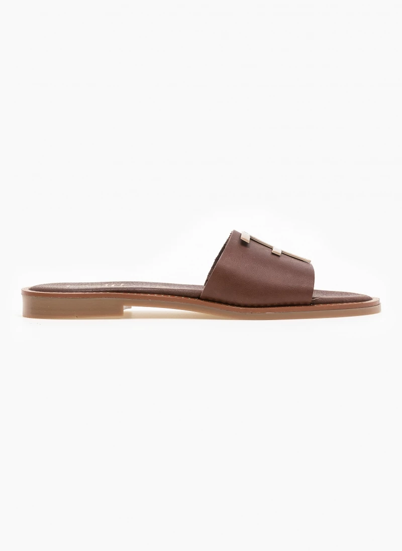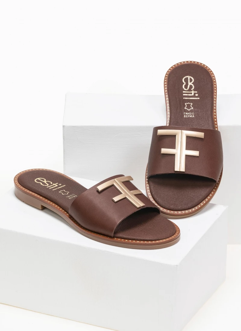 Estil δερμάτινα σανδάλια με φάσα και μεταλλικό διακοσμητικό. Ο πάτος είναι δερμάτινος με ενίσχυση. Έχουν μαλακή σόλα. Ελληνικής κατασκευής.