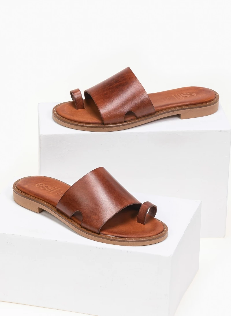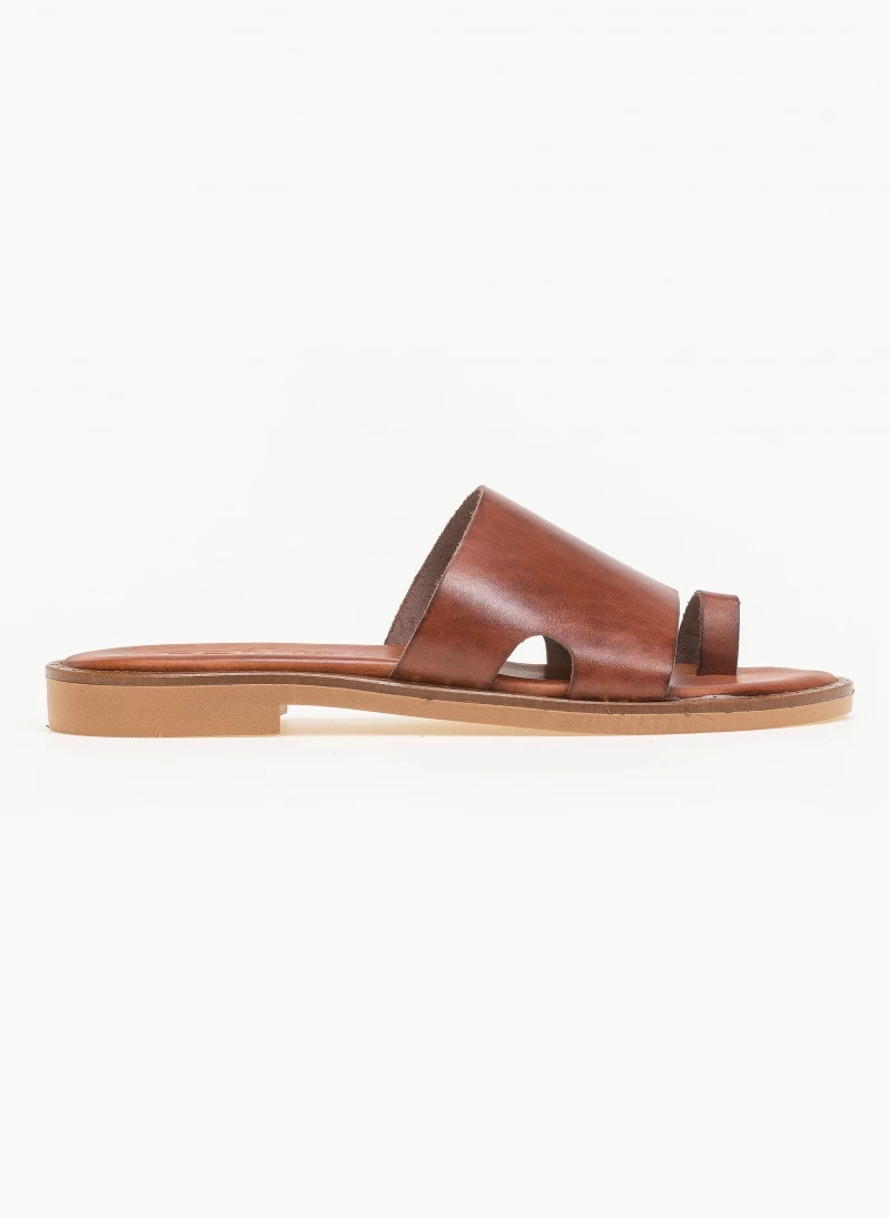 Estil δερμάτινα σανδάλια με φαρδιά φάσα. Έχουν μικρά ανοίγματα στο πλάι. Ο πάτος είναι δερμάτινος με ενίσχυση. Ελληνικής κατασκευής, χειροποίητα.