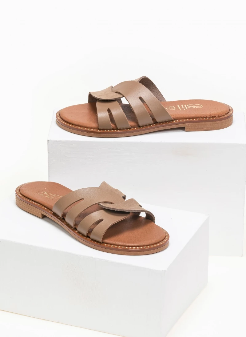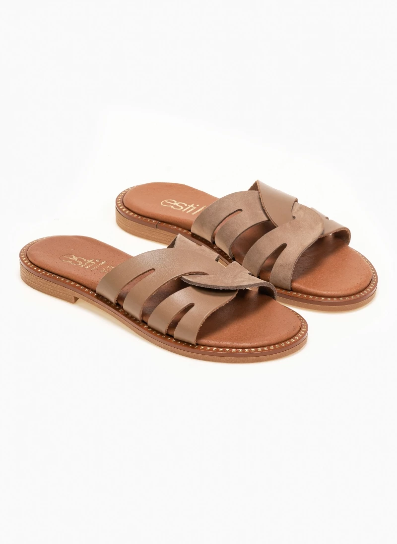 Estil δερμάτινα σανδάλια με περαστές φάσες. Έχουν δερμάτινο πάτο με ενίσχυση. Η σολα είναι μαλακή από λάστιχο και έχει λεπτομέρειες σε χρυσό χρώμα. Ελληνικής κατασκευής, χειροποίητα.