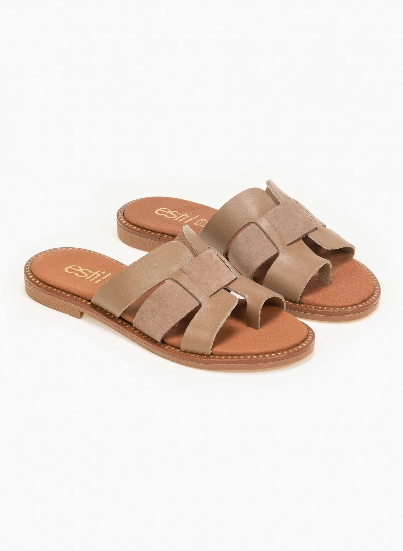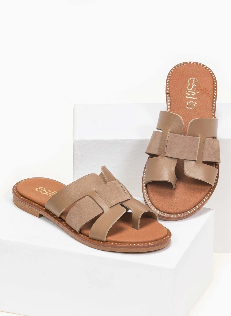 Estil δερμάτινα σανδάλια με περαστή φάσα και ανοίγματα. Ο πάτος είναι δερμάτινος με ενίσχυση. Έχουν λεπτομέρεια μεταλλικό χρώμα περιμετρικά της σόλας. Ελληνικής κατασκευής, χειροποίητα.