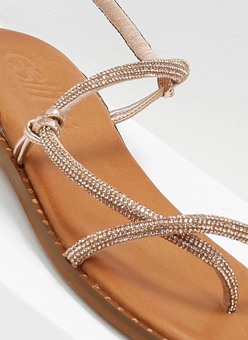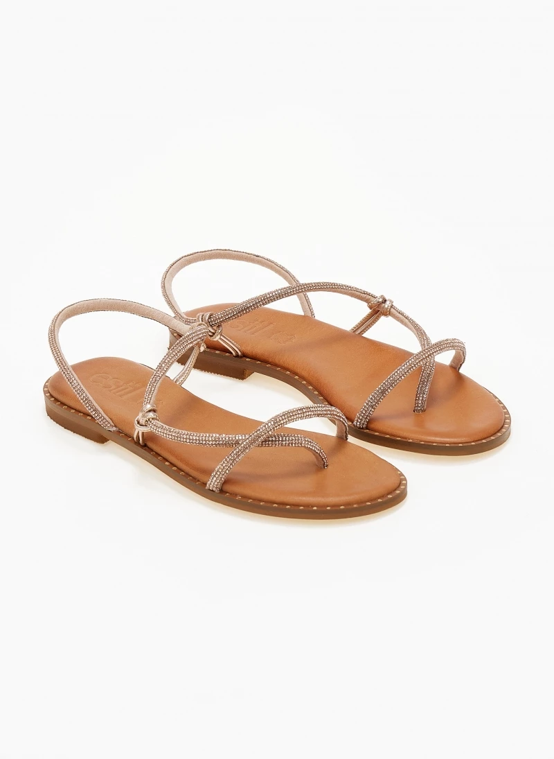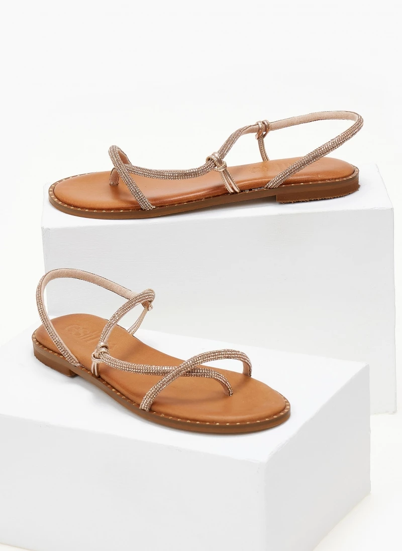 Σανδάλια δερμάτινα με strass λουράκια. Έχουν λεπτομέρεια μεταλλικό χρώμα περιμετρικά της σόλας. Μαλακός δερμάτινος πάτος με ενίσχυση. Ελληνικής κατασκευής.