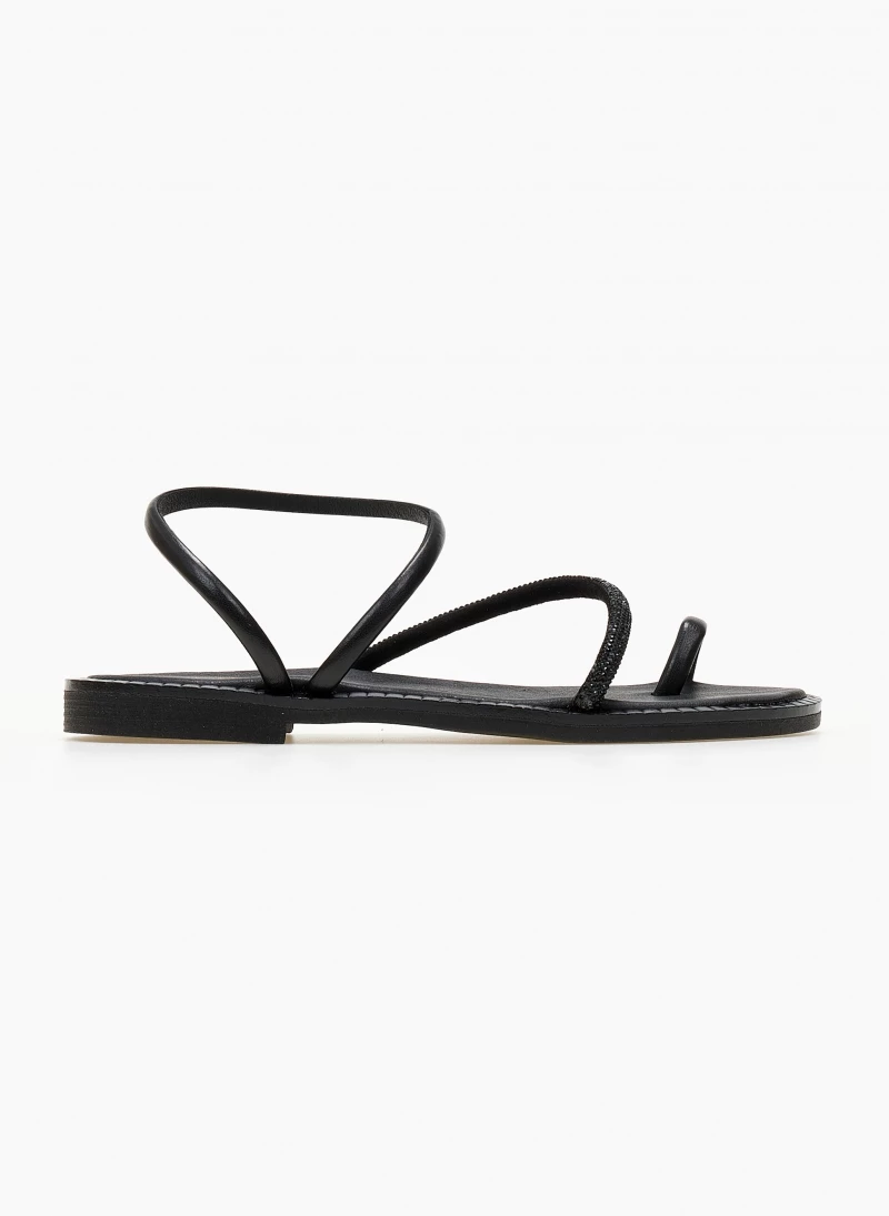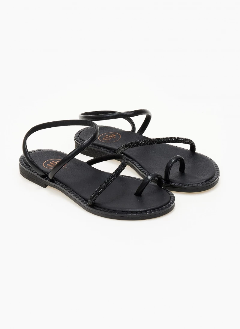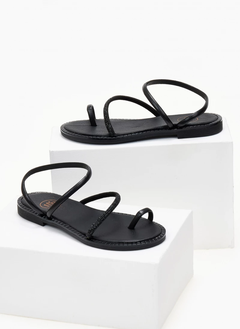 Σανδάλια δερμάτινα TFP με περαστό λουράκι. Έχουν μικρά strass στο ύψος του κουτεπιέ. Δερμάτινος πάτος με ενίσχυση. Ανάγλυφο σχέδιο περιμετρικά της σόλας. Ελληνικής κατασκευής.