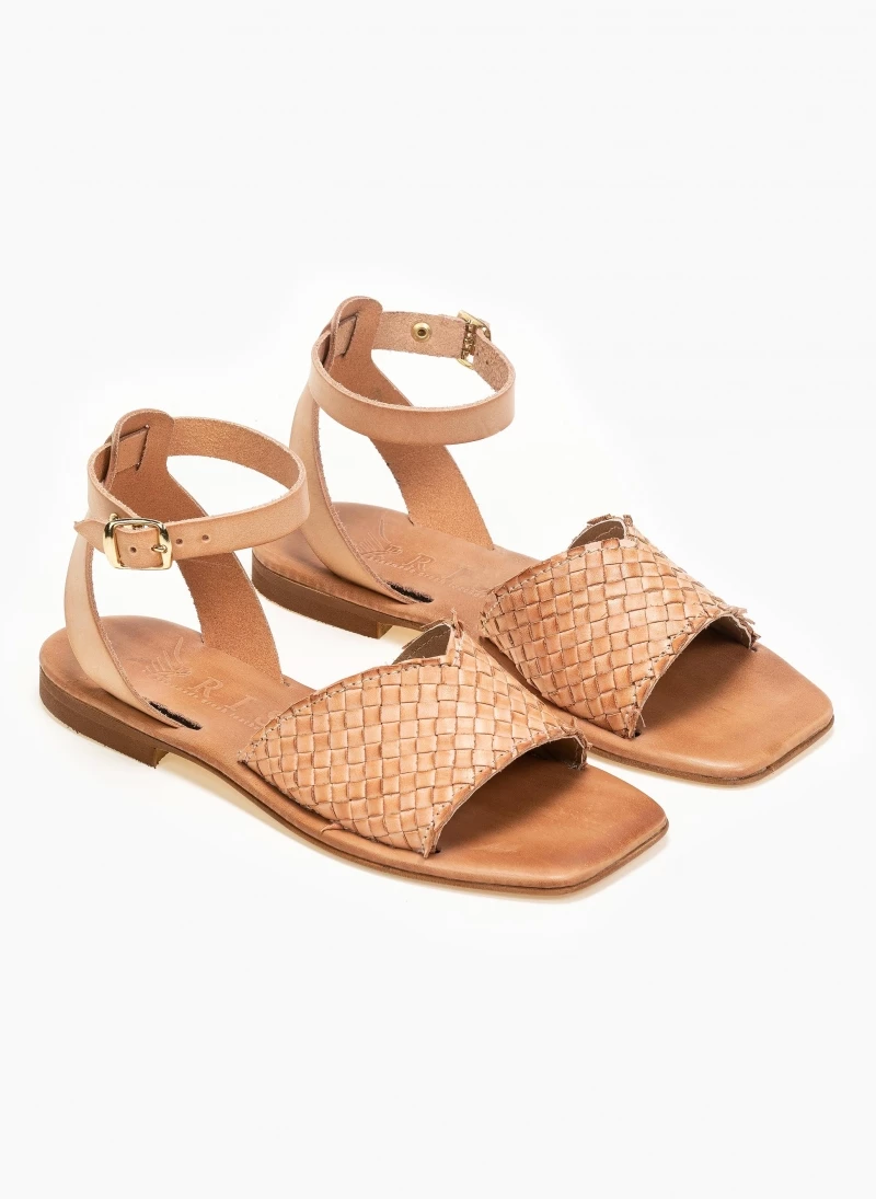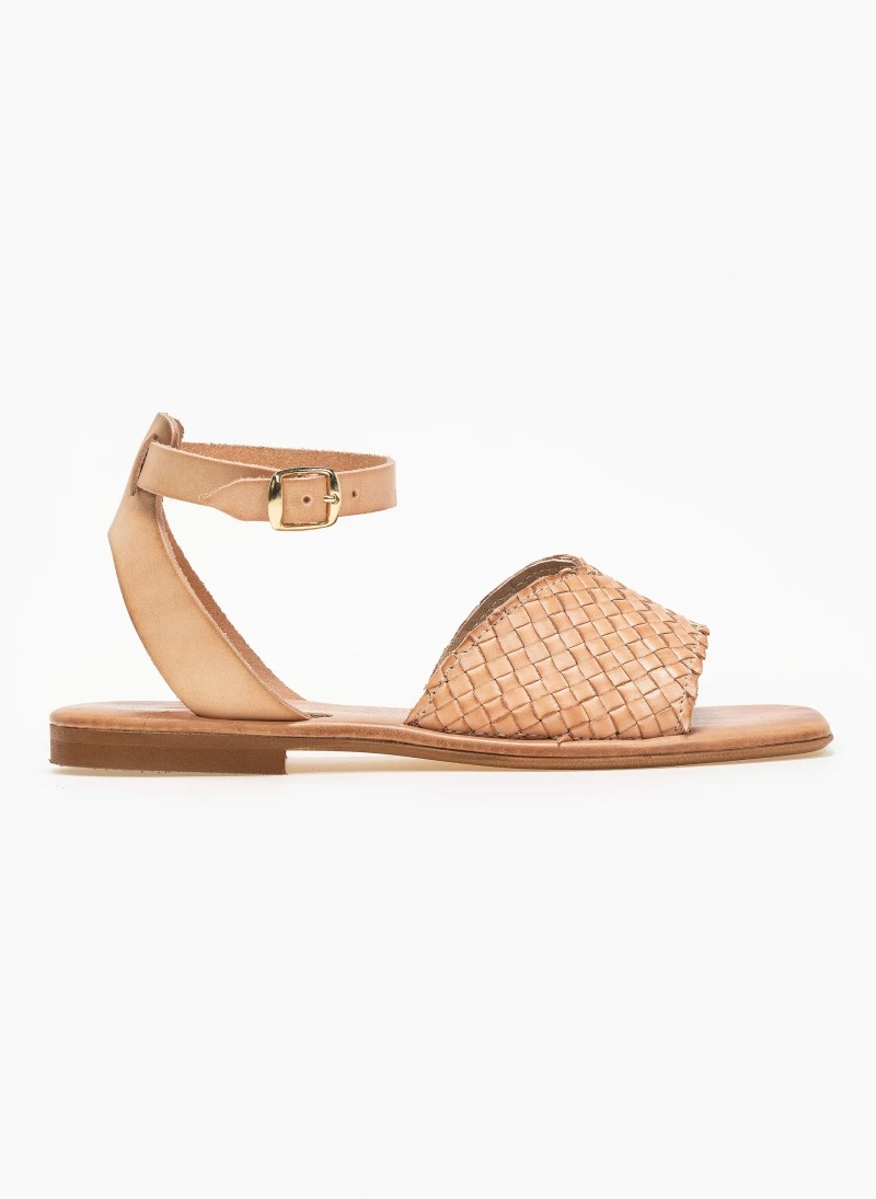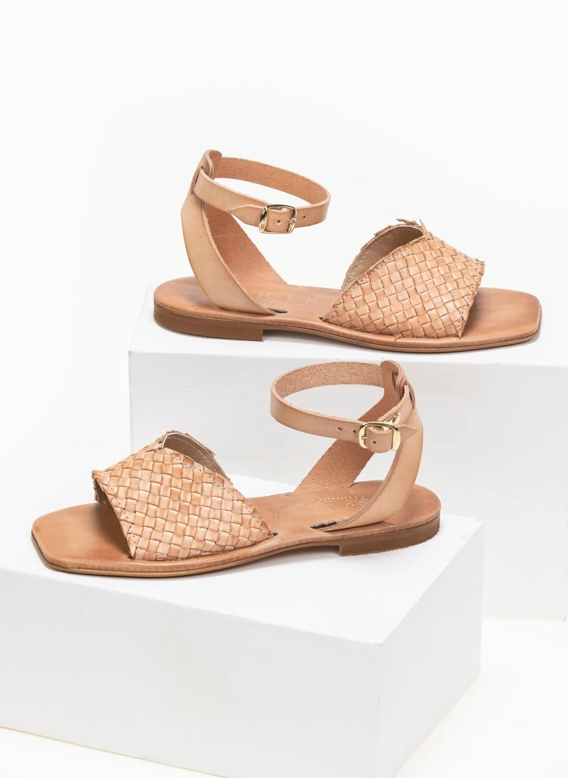 Δερμάτινα ίσια πέδιλα σε καρέ γραμμή με φαρδιά φάσα και pattern πλεκτό. Δένουν στο πλάι. Ο πάτος είναι δερμάτινος με ενίσχυση. Ελληνικής κατασκευής, χειροποίητα.