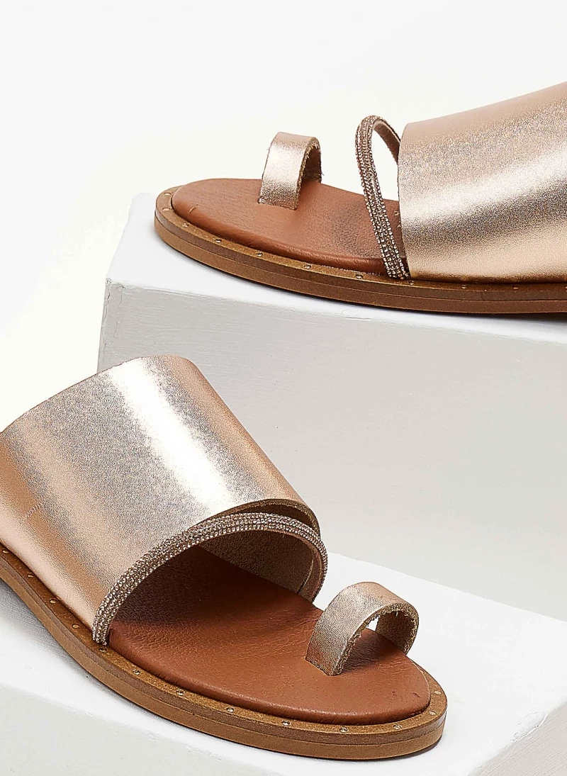 ESTIL δερμάτινα σανδάλια με φαρδιά φάσα. Έχουν λεπτή σειρά strass. Λεπτομέρεια σε μεταλλικό χρώμα περιμετρικά της σόλας. Δερμάτινος πάτος με ενίσχυση. Ελληνικής κατασκευής.