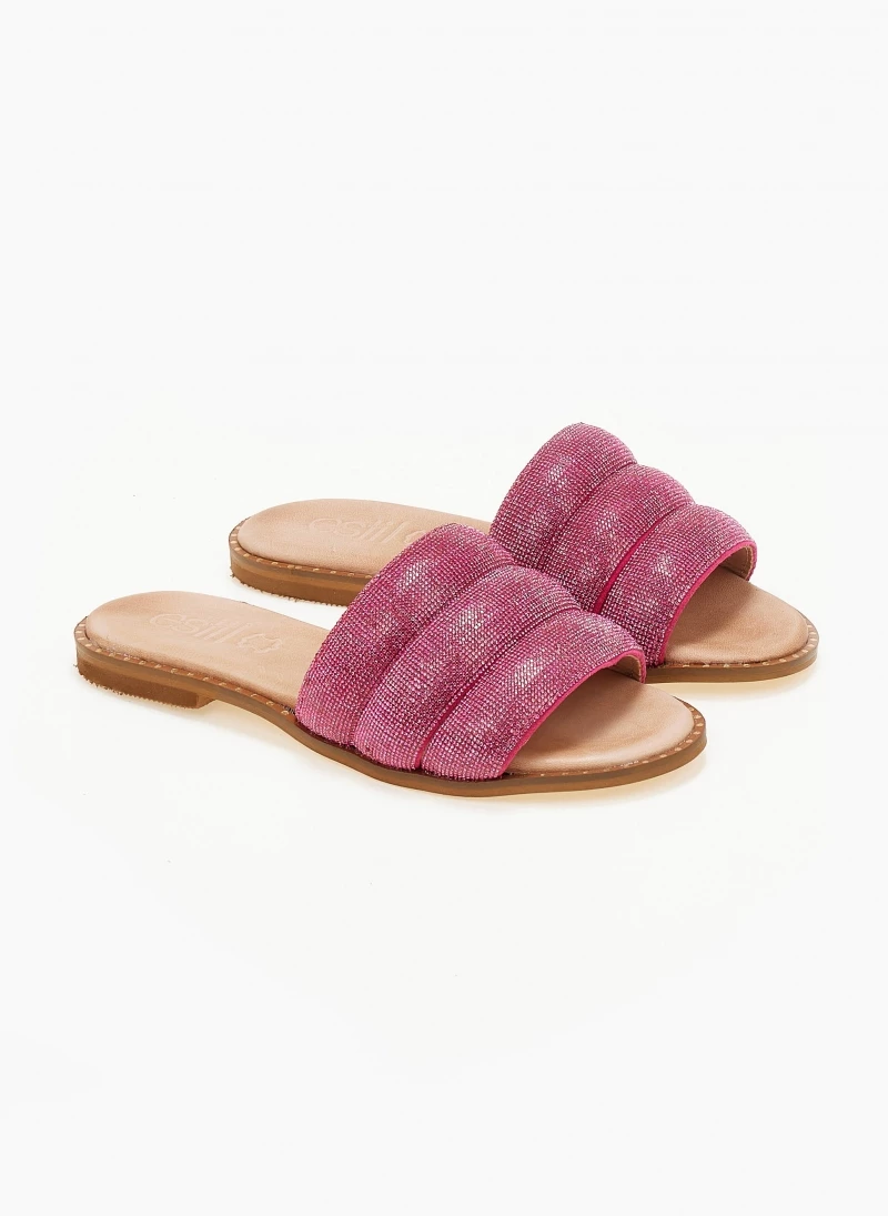 Σανδάλια δερμάτινα ESTIL με φαρδιά strass φάσα. Έχουν λεπτομέρεια μεταλλικό χρώμα περιμετρικά της σόλας. Δερμάτινος πάτος με ενίσχυση. Ελληνικής κατασκευής.