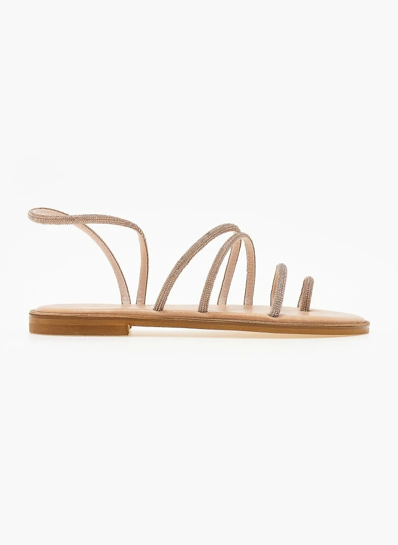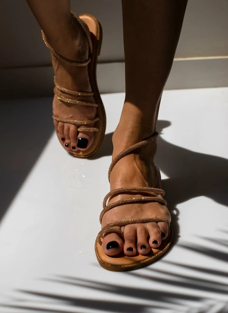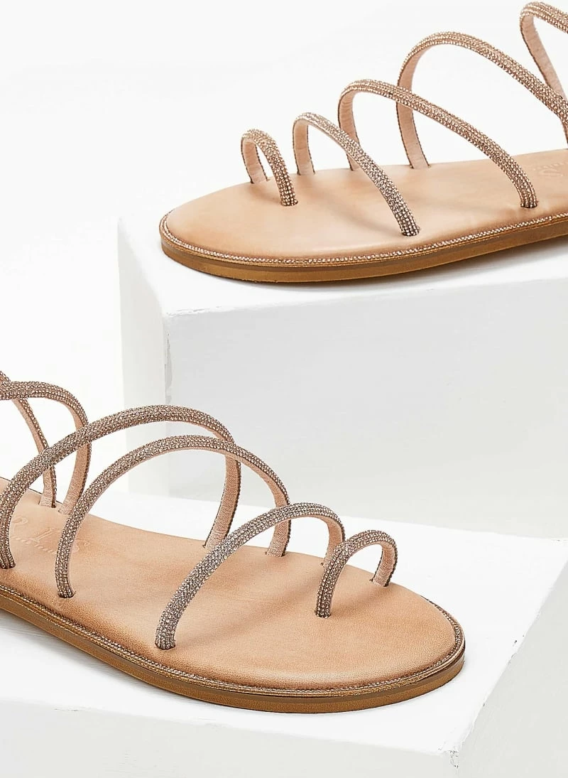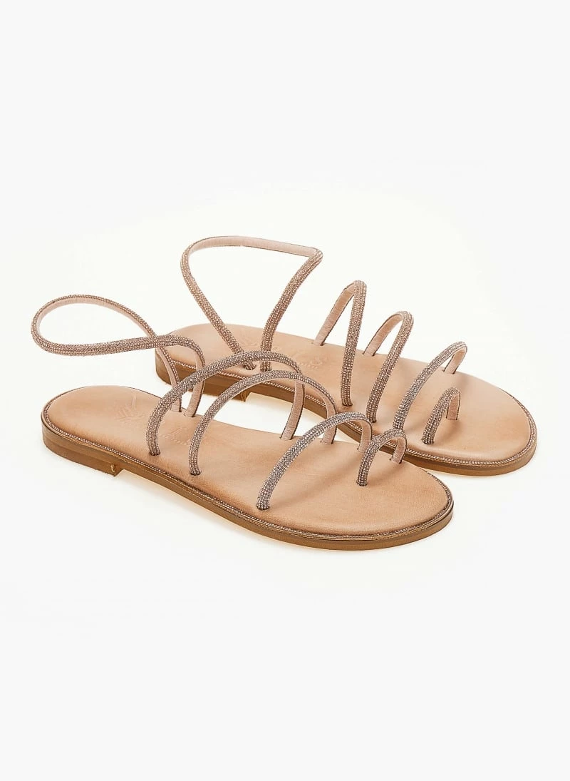 Σανδάλια δερμάτινα IRIS. Έχουν λεπτά strass λουράκια. Περαστό δέσιμο στο ύψος του αστραγάλου. Δερμάτινος πάτος με ενίσχυση. Ελληνικής κατασκευής.