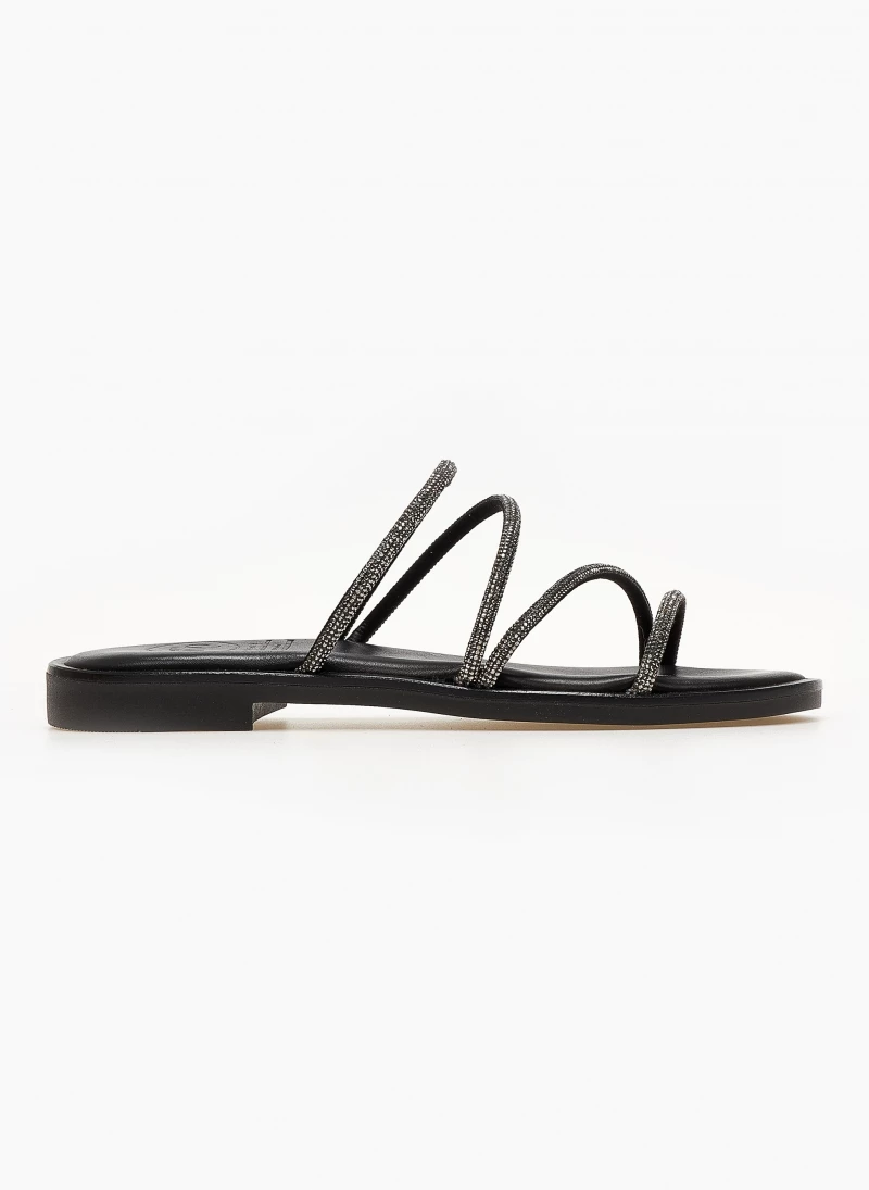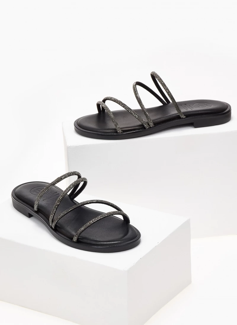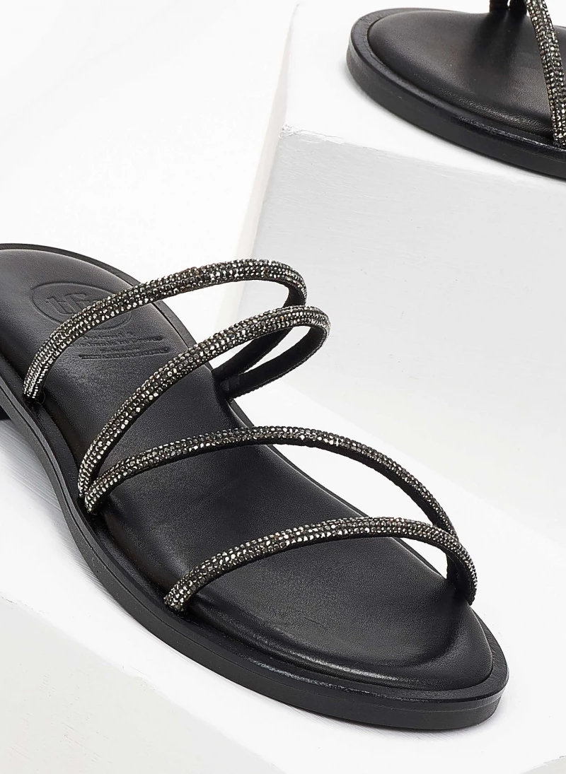 Σανδάλια δερμάτινα TFP με λεπτά strass λουράκια.Έχουν λεπτομέρεια σε μεταλλικό χρώμα περιμετρικά της σόλας.Δερμάτινος πάτος με ενίσχυση.Ελληνικής κατασκευής.