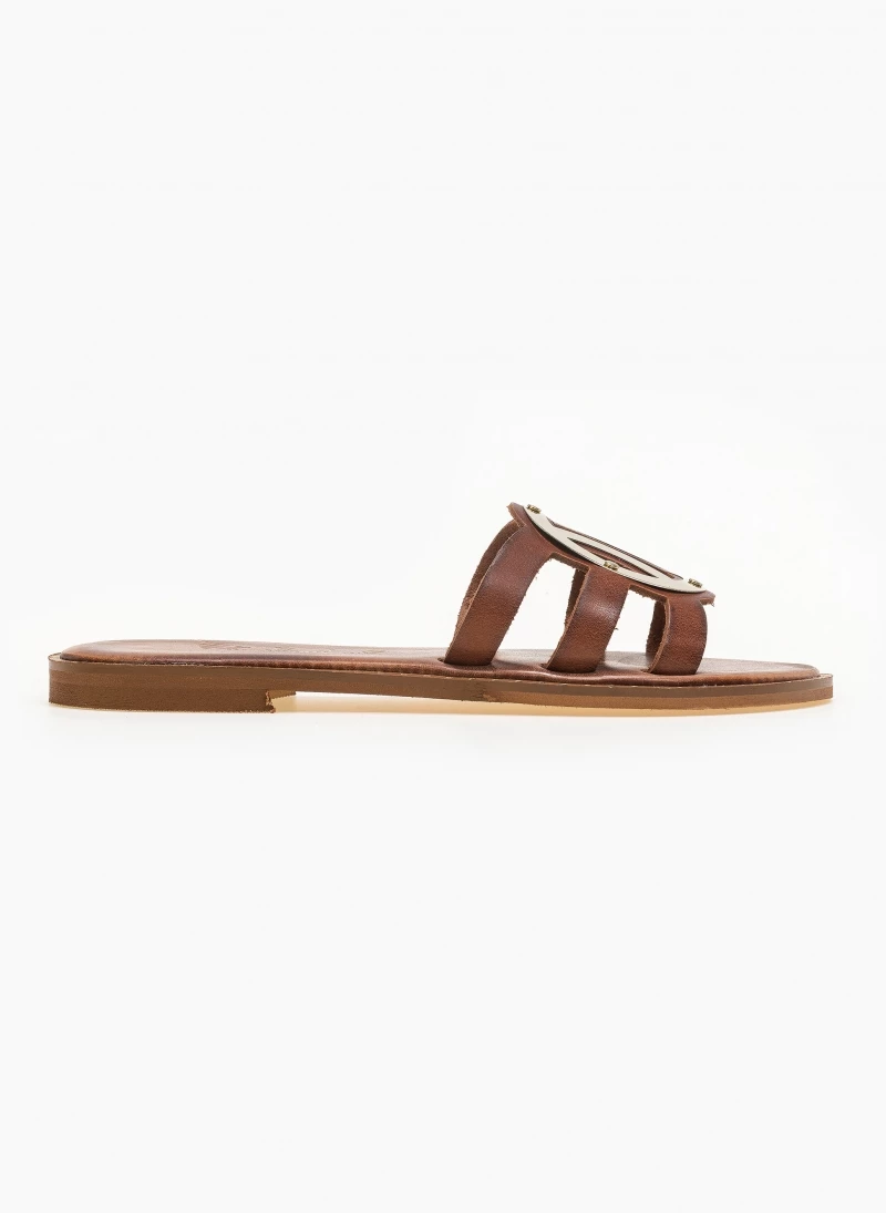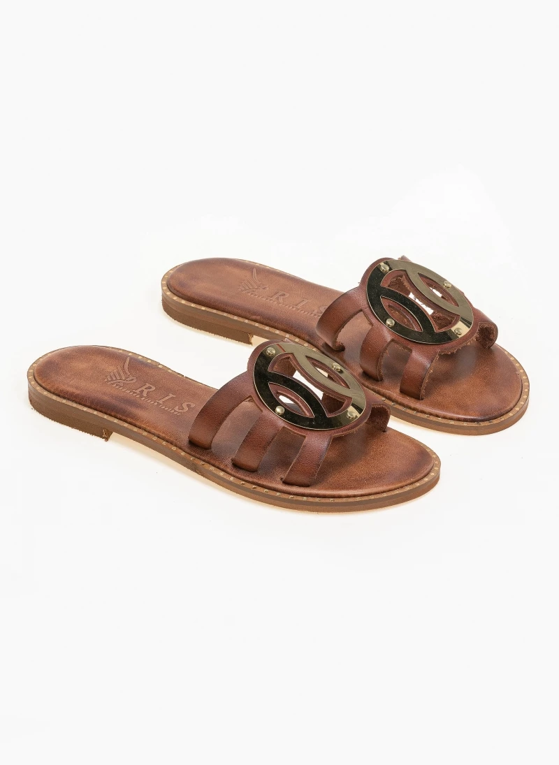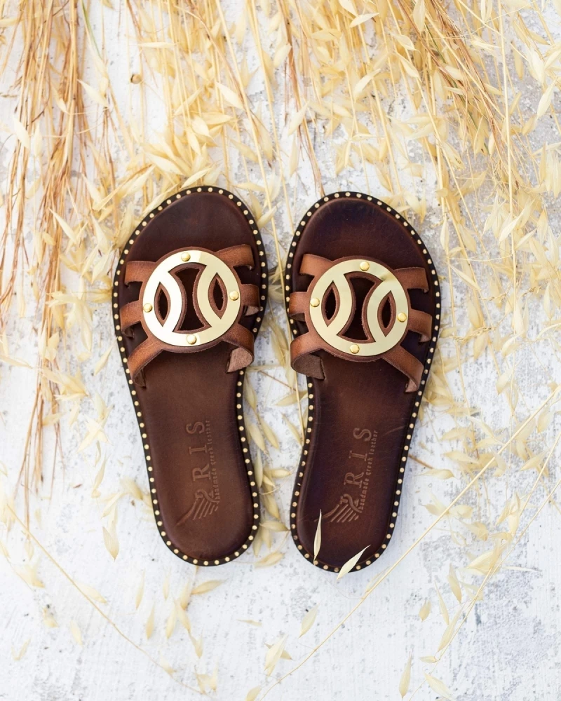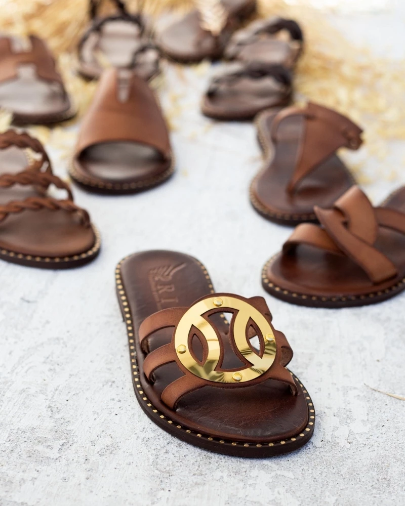 Δερμάτινα σανδάλια με μεγάλη στρογγυλή αγκράφα. Έχουν δερμάινο πάτο με ενίσχυση και λεπτομέρεια σε μεταλλικό χρώμα περιμετρικά της σόλας. Ελληνικής κατασκευής.