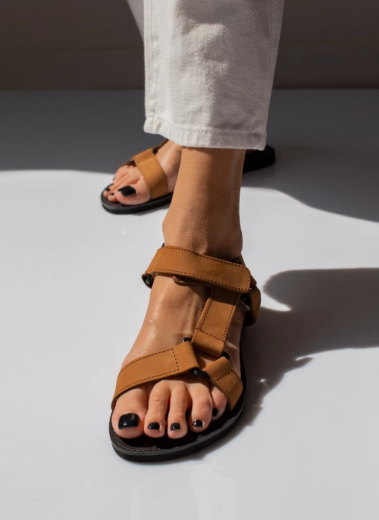Estil φλατ δερμάτινα nubuck σανδάλια με velcro αυτοκόλλητο. Αναγεννημένο δέρμα πάτος. Ελληνικής κατασκευής.