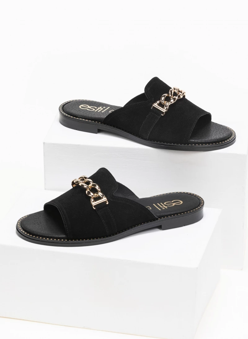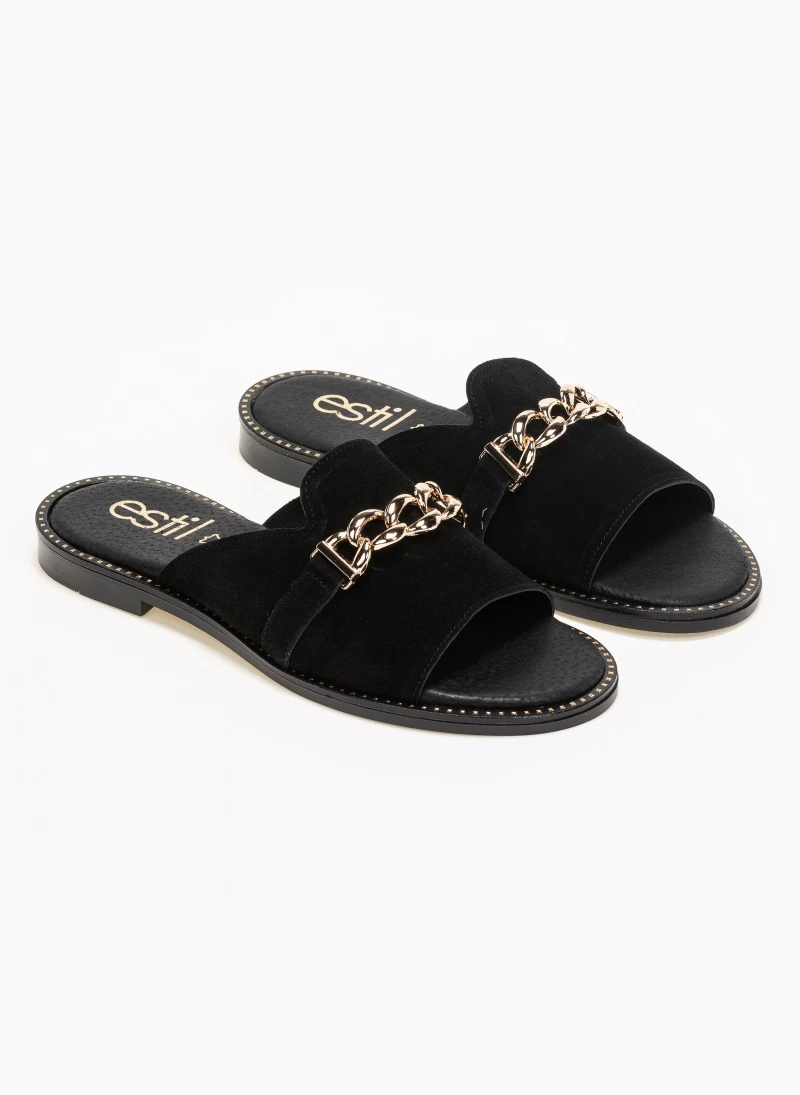 Estil καστόρινα σανδάλια με φαρδιά φάσα και αλυσίδα. Ο πάτος είναι δερμάτινος με ενίσχυση. Ελληνικής κατασκευής.
