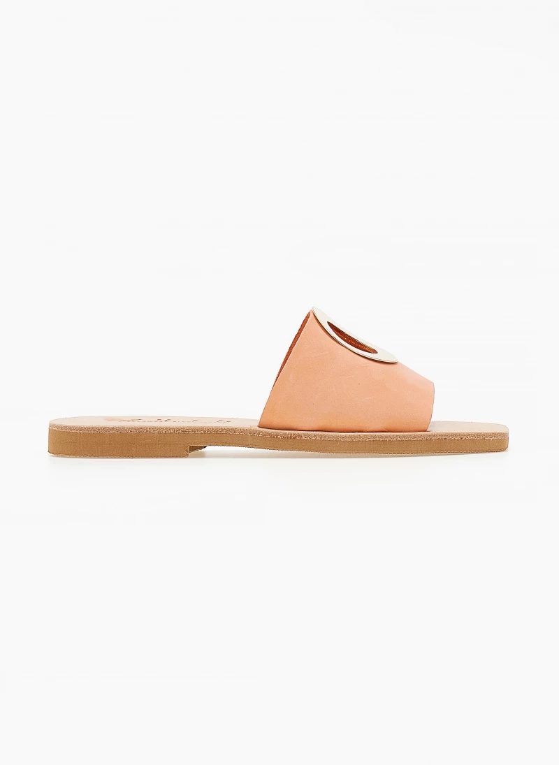 Σανδάλια από nubuck δέρμα με φαρδιά φάσα. Έχουν μεταλλικό στοιχείο με άνοιγμα σε σχήμα κύκλο. Δερμάτινος πάτος. Ελληνικής κατασκευής,χειροποίητα.