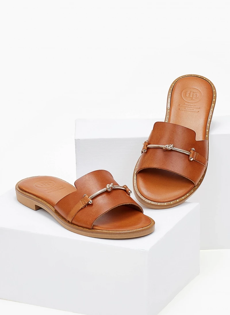 TFP δερμάτινα σανδάλια με φαρδιά φάσα και μεταλλική αλυσίδα σε χρυσό χρώμα. Έχει μαλακό πάτο. Έλληνικής κατασκευής.