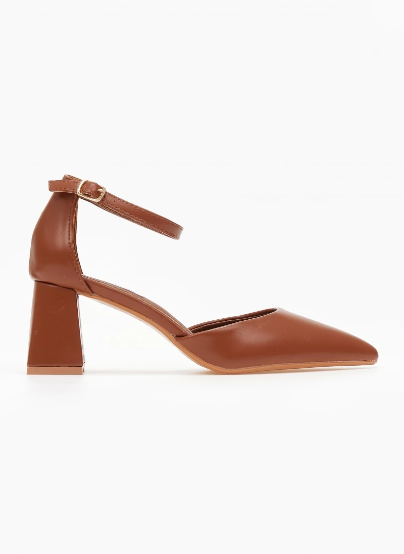 Γόβες μυτερές με ανοιχτά πλαΙνά. Έχουν κλειστή φτέρνα. Δένουν με μπαρέτα στο ύψος του αστραγάλου. Χαμηλό χοντρό τακούνι.