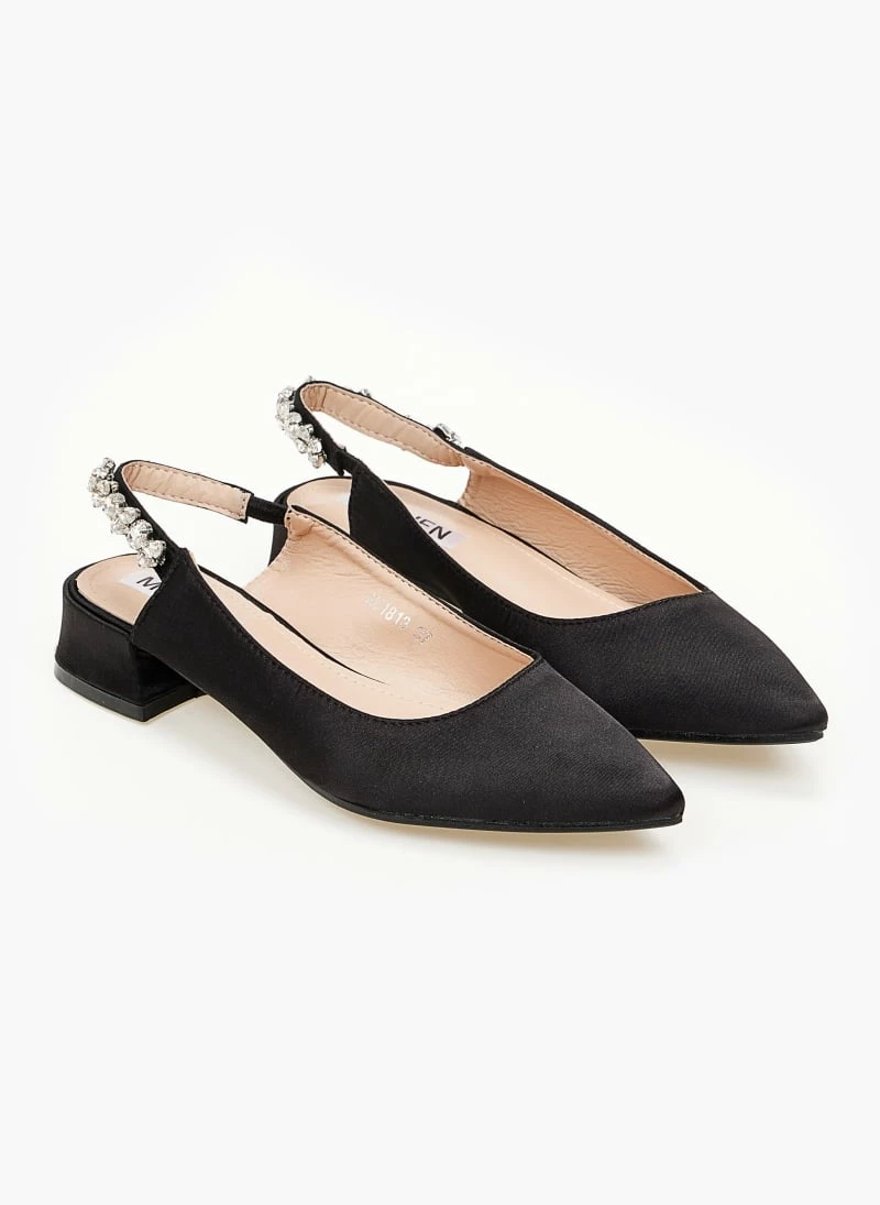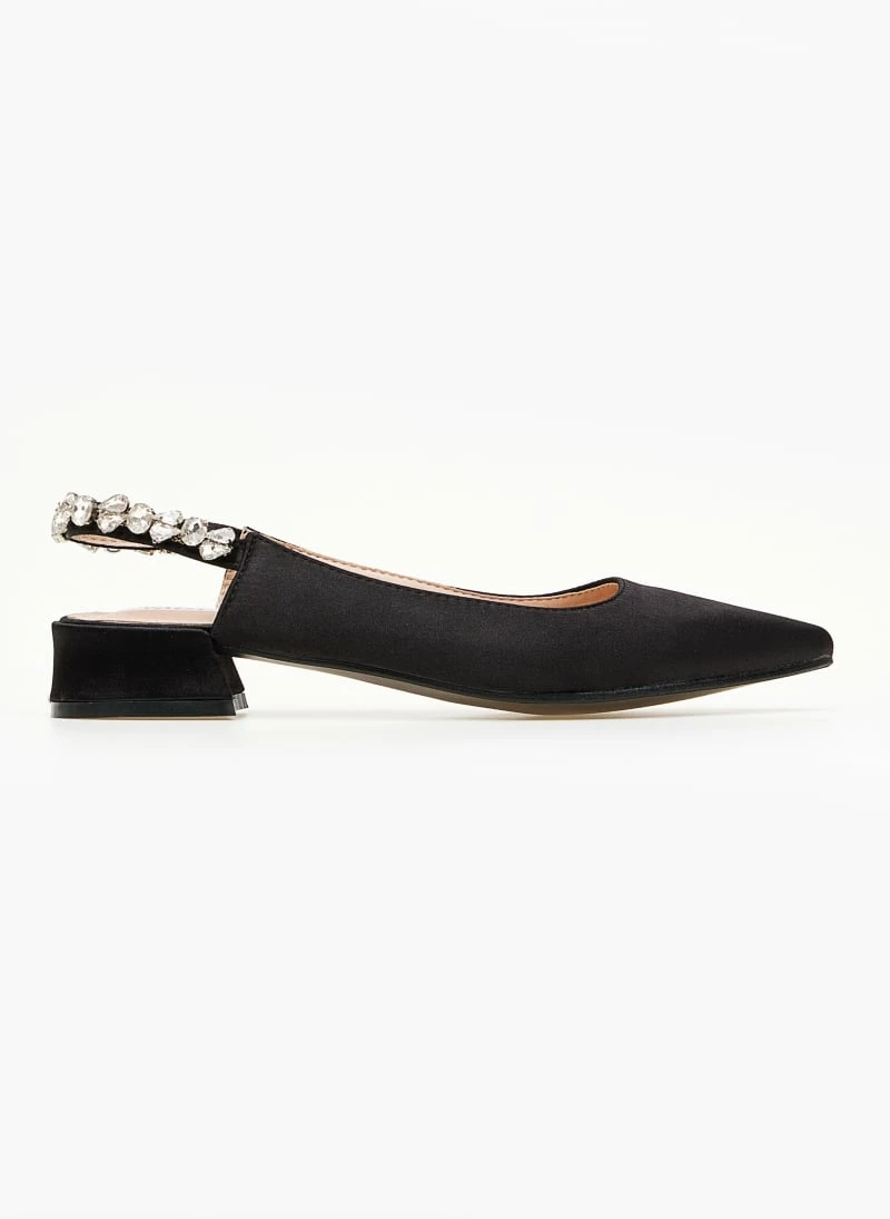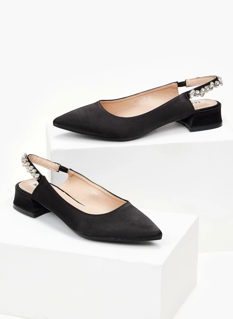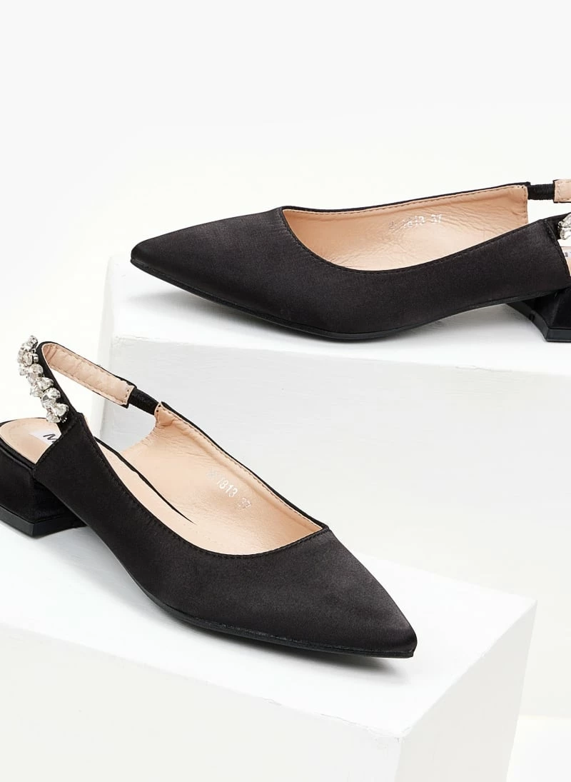 Μυτερές σατέν γοβες χωρίς τακούνι.Έχουν ελαστικό τμήμα και πέτρες strass στο λουράκι.