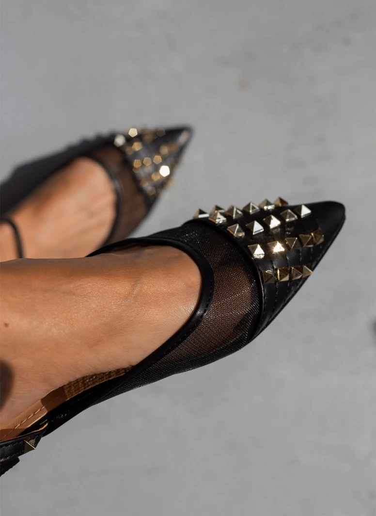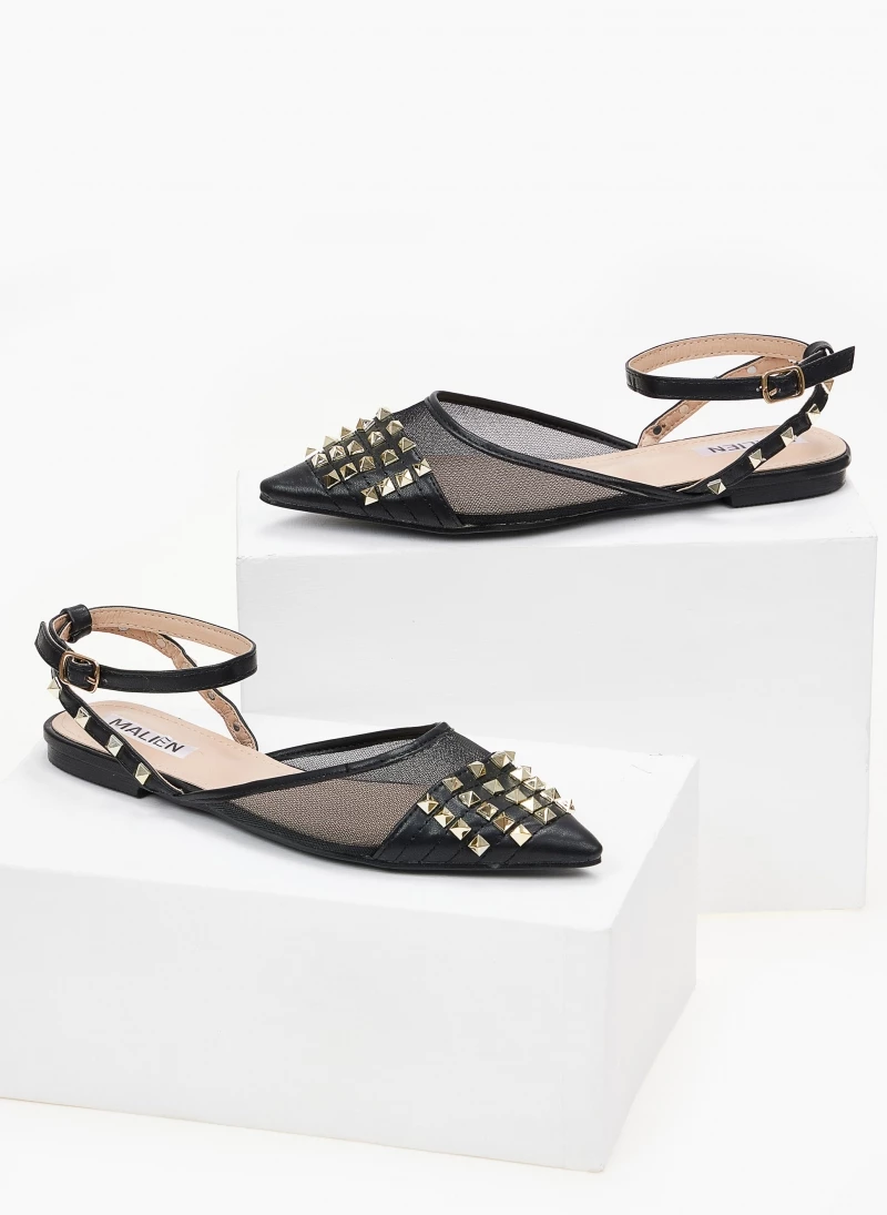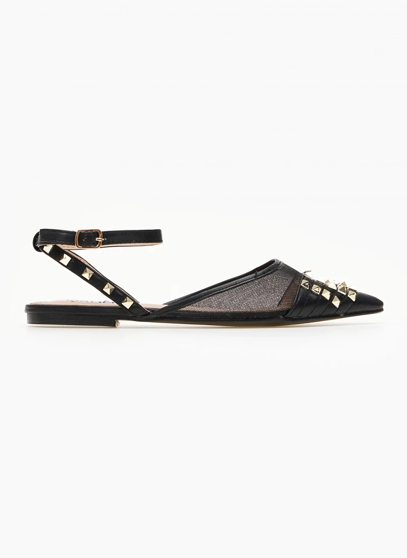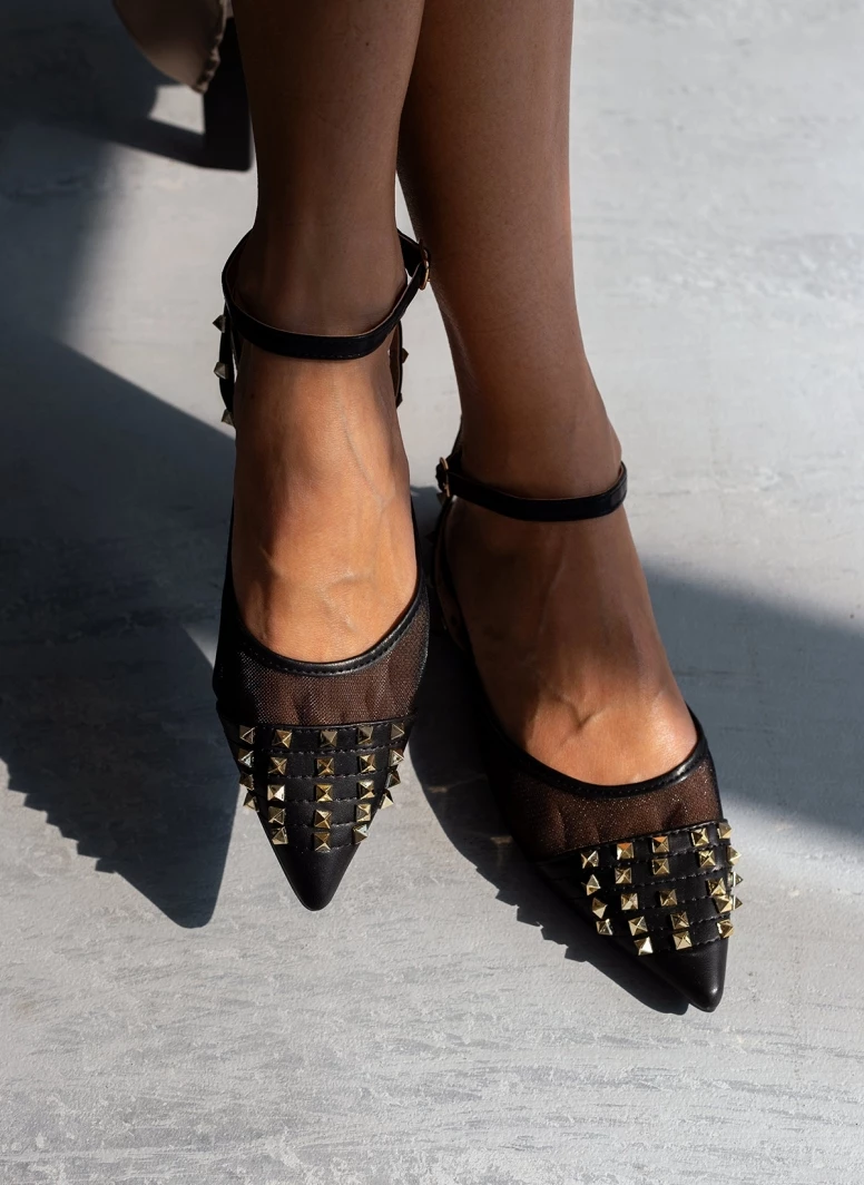 Ίσιες μυτερές μπαλαρίνες με διαφάνεια.Έχουν μεταλλικά διακοσμητικά τρουκς.Δένουν με μπαρέτα στο ύψος του αστραγάλου.