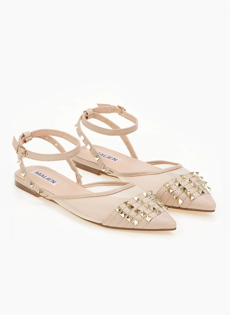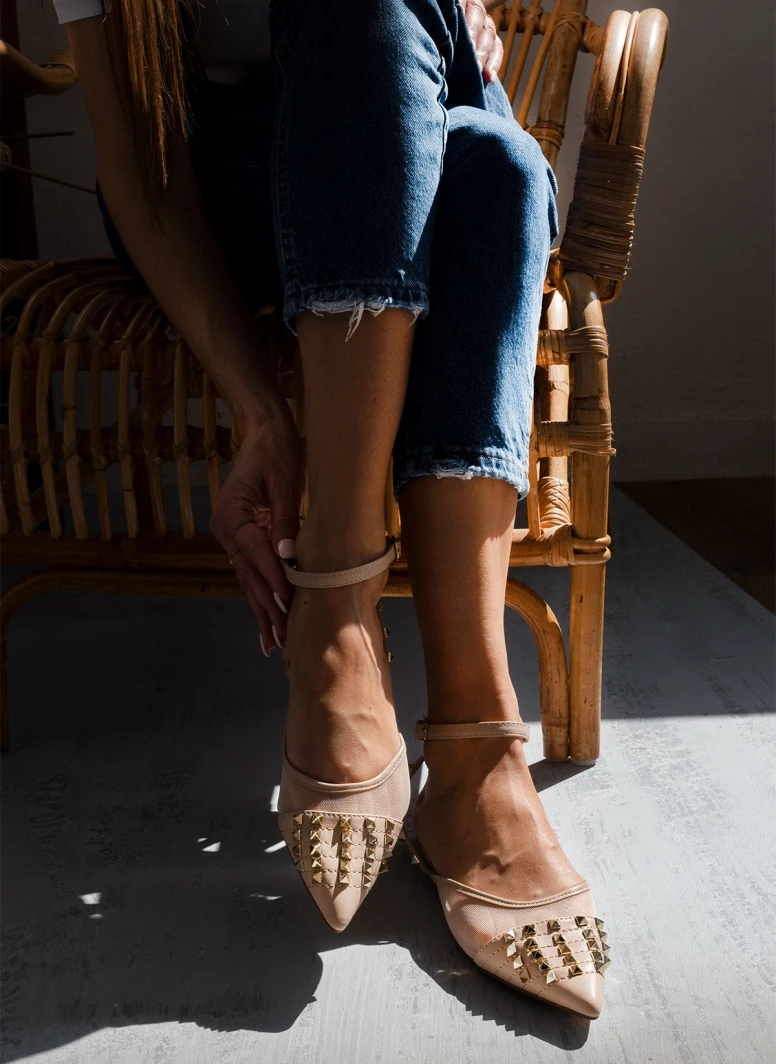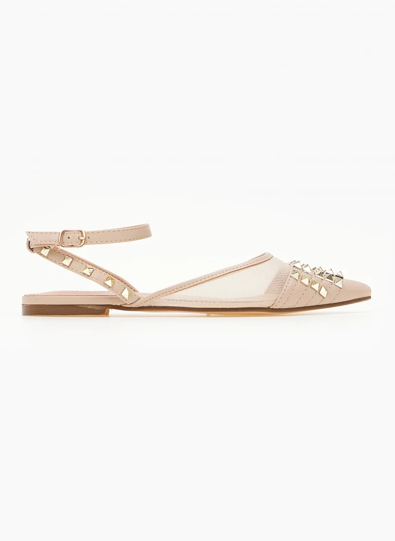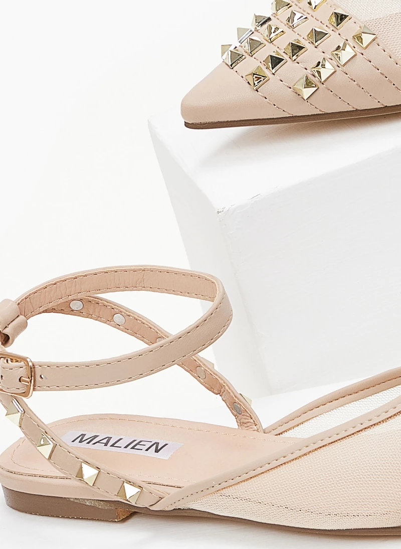 Ίσιες μυτερές μπαλαρίνες με διαφάνεια.Έχουν μεταλλικά διακοσμητικά τρουκς.Δένουν με μπαρέτα στο ύψος του αστραγάλου.