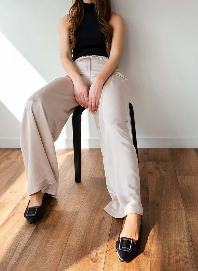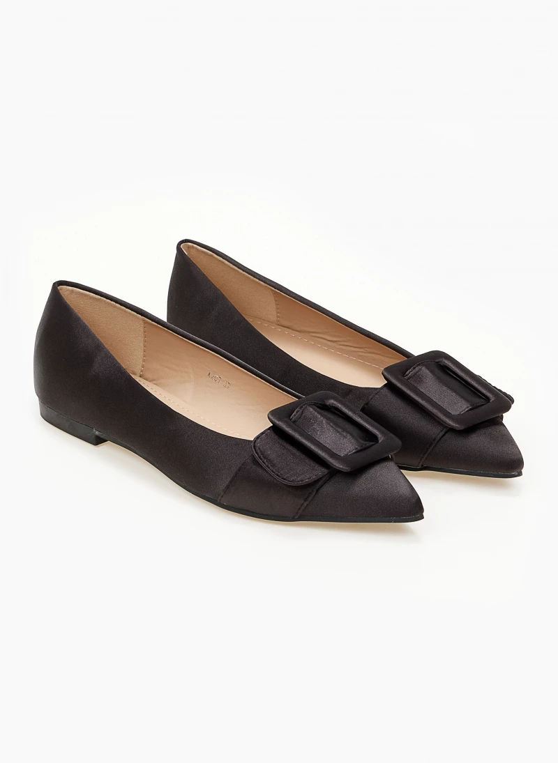 Μυτερές σατέν μπαλαρίνες χωρίς τακούνι.Έχουν ντυμένη τετράγωνη αγκράφα στο ίδιο χρώμα.