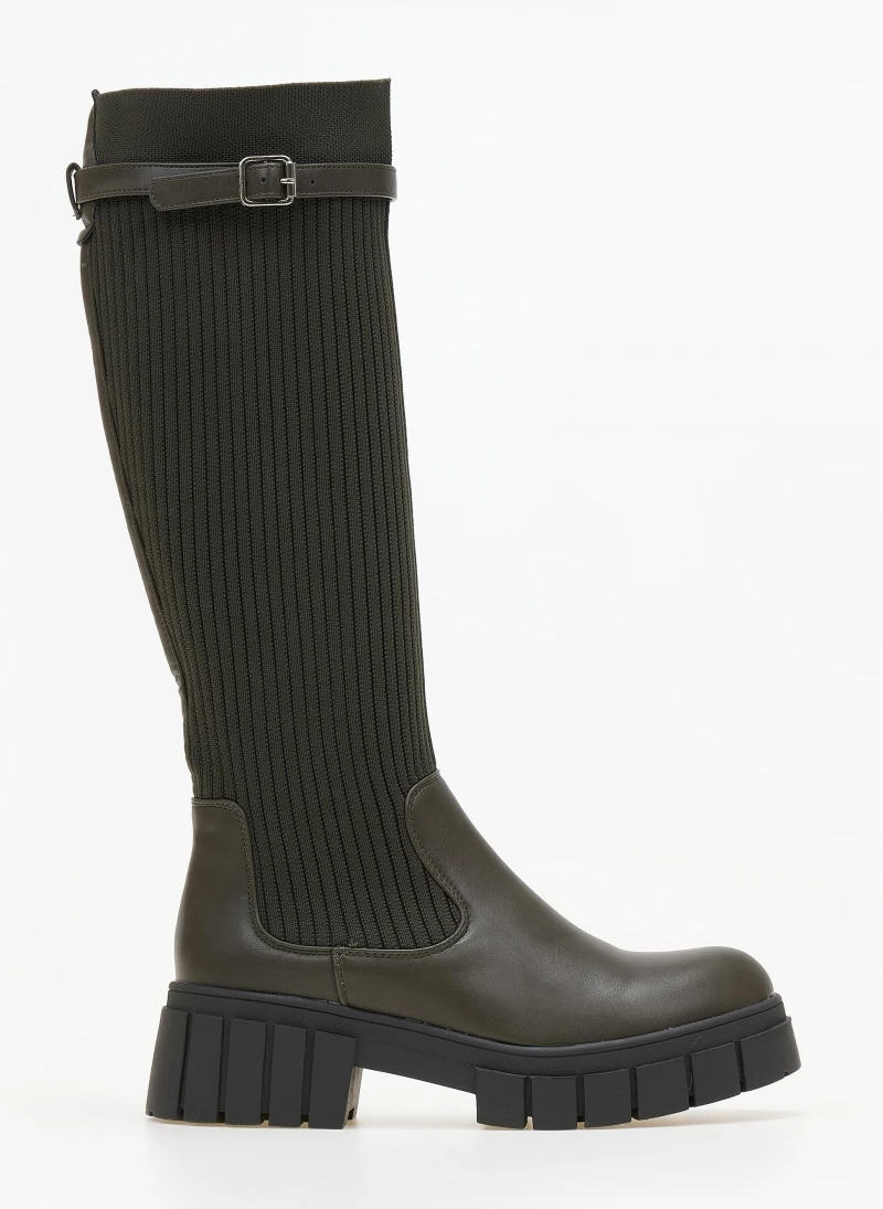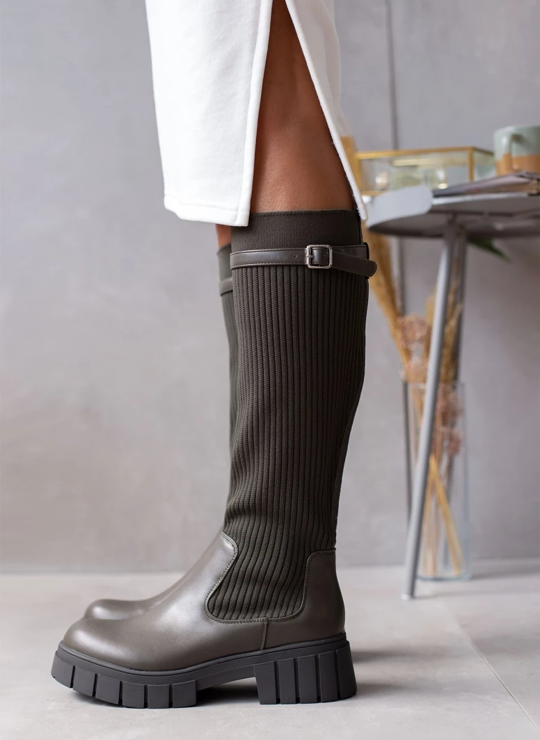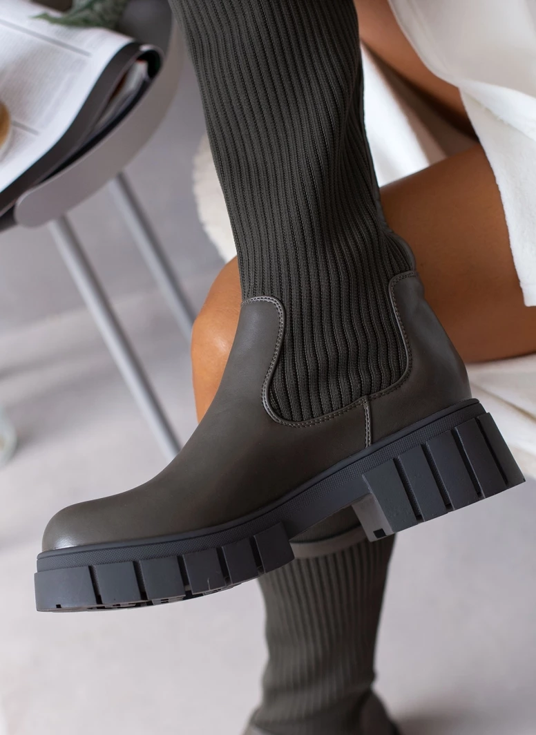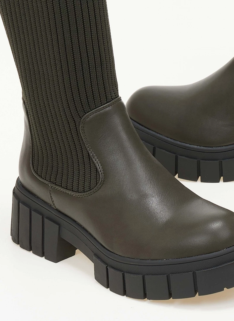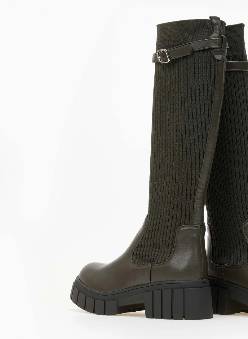 Μπότες με chunky σόλα. Έχουν σχέδιο κάλτσα στη γάμπα. Λεπτό ζωνάκι δερματίνη στο τελείωμα. Στρογγυλή φόρμα.