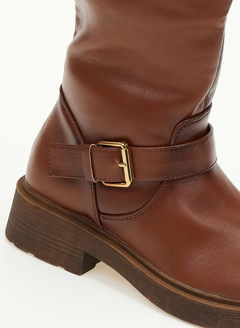Casual μπότες σε στρογγυλή γραμμή. Διαθέτουν δύο ζωνάκια ,στο κουντεπιέ και στο τελείωμα. Έχουν φερμουάρ εσωτερικά στο μισό ύψος της μπότας.